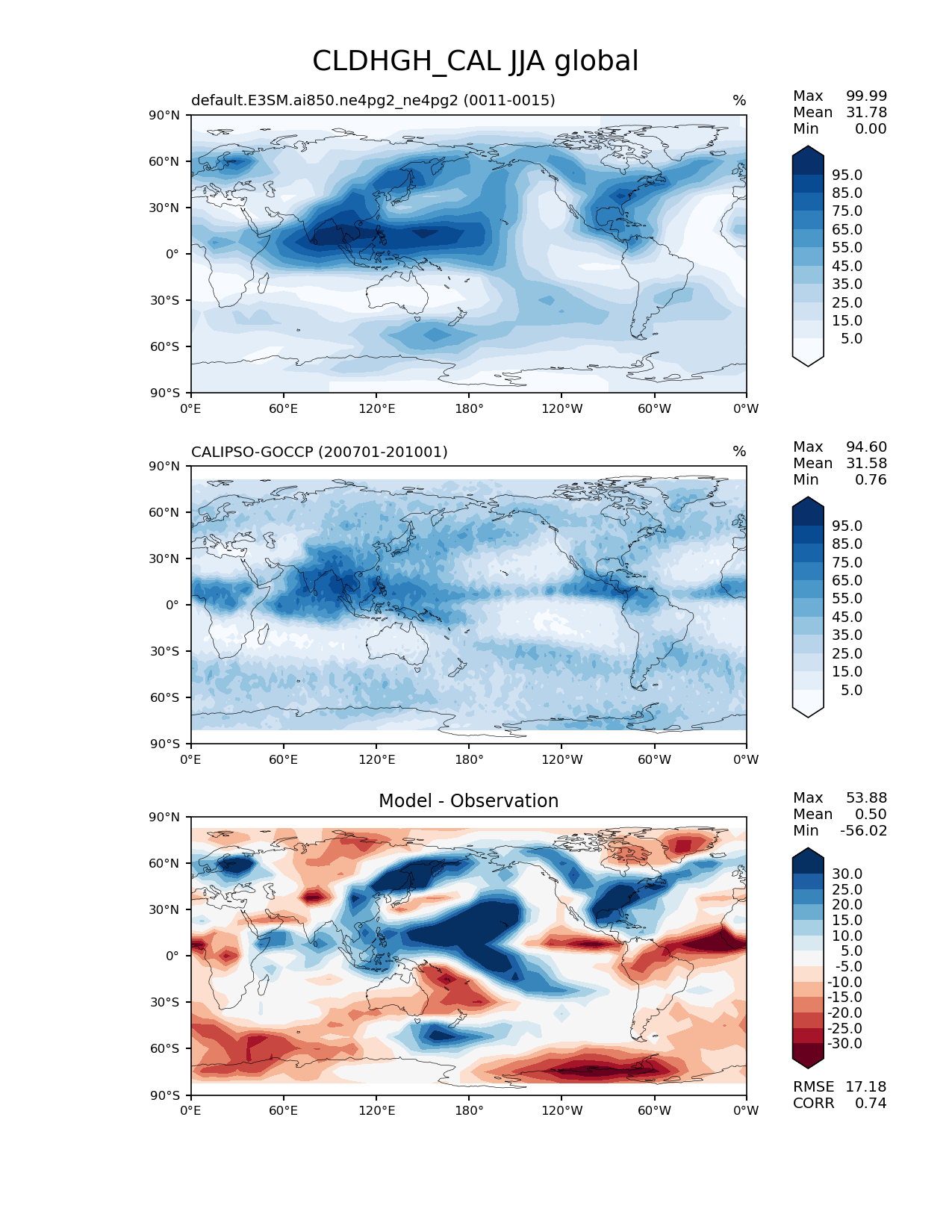 Use this command to recreate this image: | e3sm_diags lat_lon --no_viewer --case_id 'Cloud Calipso' --sets 'lat_lon' --run_type 'model_vs_obs' --variables 'CLDHGH_CAL' --seasons 'JJA' --regions 'global' --regrid_tool 'esmf' --regrid_method 'conservative' --main_title 'CLDHGH_CAL JJA global' --backend 'mpl' --output_format 'png' --canvas_size_w '1212' --canvas_size_h '1628' --figsize '8.5' '11.0' --dpi '150' --arrows --contour_levels '5' '15' '25' '35' '45' '55' '65' '75' '85' '95' --test_name 'default.E3SM.ai850.ne4pg2_ne4pg2' --test_colormap 'Blues' --ref_name 'CALIPSOCOSP' --reference_name 'CALIPSO-GOCCP' --reference_colormap 'Blues' --diff_title 'Model - Observation' --diff_colormap 'RdBu' --diff_levels '-30' '-25' '-20' '-15' '-10' '-5' '5' '10' '15' '20' '25' '30' --multiprocessing --num_workers '32' --granulate 'variables' 'seasons' 'plevs' 'regions' --selectors 'sets' 'seasons' --reference_data_path '/global/cfs/cdirs/e3sm/acme_diags/obs_for_e3sm_diags/climatology/' --test_data_path '/global/cfs/cdirs/e3sm/emulate/postproc_e3sm/slice/default.E3SM.ai850.ne4pg2_ne4pg2' --results_dir '/global/cfs/cdirs/e3sm/www/wagmanbe/slice/default.E3SM.ai850.ne4pg2_ne4pg2' |