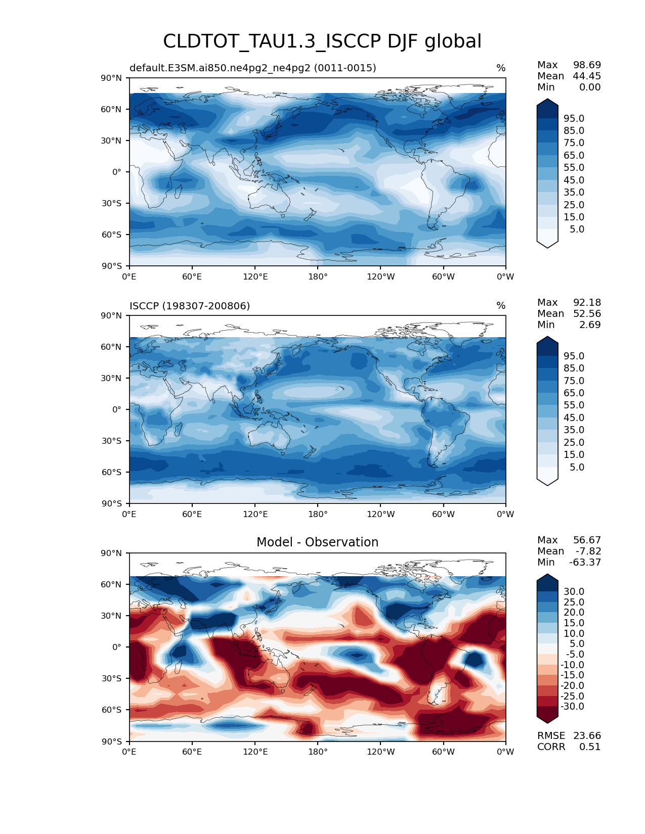 Use this command to recreate this image: | e3sm_diags lat_lon --no_viewer --case_id 'Cloud ISCCP' --sets 'lat_lon' --run_type 'model_vs_obs' --variables 'CLDTOT_TAU1.3_ISCCP' --seasons 'DJF' --regions 'global' --regrid_tool 'esmf' --regrid_method 'conservative' --main_title 'CLDTOT_TAU1.3_ISCCP DJF global' --backend 'mpl' --output_format 'png' --canvas_size_w '1212' --canvas_size_h '1628' --figsize '8.5' '11.0' --dpi '150' --arrows --contour_levels '5' '15' '25' '35' '45' '55' '65' '75' '85' '95' --test_name 'default.E3SM.ai850.ne4pg2_ne4pg2' --test_colormap 'Blues' --ref_name 'ISCCPCOSP' --reference_name 'ISCCP' --reference_colormap 'Blues' --diff_title 'Model - Observation' --diff_colormap 'RdBu' --diff_levels '-30' '-25' '-20' '-15' '-10' '-5' '5' '10' '15' '20' '25' '30' --multiprocessing --num_workers '32' --granulate 'variables' 'seasons' 'plevs' 'regions' --selectors 'sets' 'seasons' --reference_data_path '/global/cfs/cdirs/e3sm/acme_diags/obs_for_e3sm_diags/climatology/' --test_data_path '/global/cfs/cdirs/e3sm/emulate/postproc_e3sm/slice/default.E3SM.ai850.ne4pg2_ne4pg2' --results_dir '/global/cfs/cdirs/e3sm/www/wagmanbe/slice/default.E3SM.ai850.ne4pg2_ne4pg2' |
