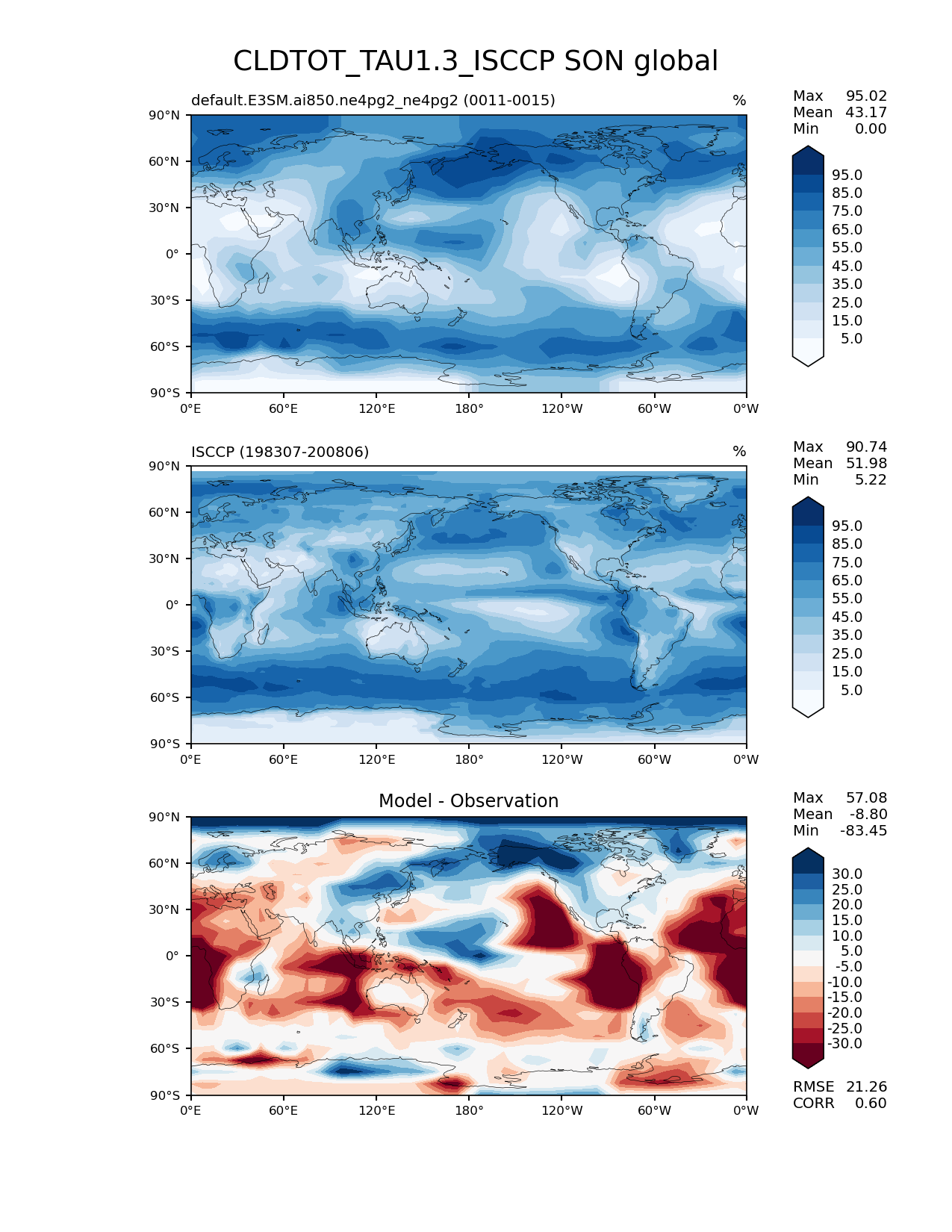 Use this command to recreate this image: | e3sm_diags lat_lon --no_viewer --case_id 'Cloud ISCCP' --sets 'lat_lon' --run_type 'model_vs_obs' --variables 'CLDTOT_TAU1.3_ISCCP' --seasons 'SON' --regions 'global' --regrid_tool 'esmf' --regrid_method 'conservative' --main_title 'CLDTOT_TAU1.3_ISCCP SON global' --backend 'mpl' --output_format 'png' --canvas_size_w '1212' --canvas_size_h '1628' --figsize '8.5' '11.0' --dpi '150' --arrows --contour_levels '5' '15' '25' '35' '45' '55' '65' '75' '85' '95' --test_name 'default.E3SM.ai850.ne4pg2_ne4pg2' --test_colormap 'Blues' --ref_name 'ISCCPCOSP' --reference_name 'ISCCP' --reference_colormap 'Blues' --diff_title 'Model - Observation' --diff_colormap 'RdBu' --diff_levels '-30' '-25' '-20' '-15' '-10' '-5' '5' '10' '15' '20' '25' '30' --multiprocessing --num_workers '32' --granulate 'variables' 'seasons' 'plevs' 'regions' --selectors 'sets' 'seasons' --reference_data_path '/global/cfs/cdirs/e3sm/acme_diags/obs_for_e3sm_diags/climatology/' --test_data_path '/global/cfs/cdirs/e3sm/emulate/postproc_e3sm/slice/default.E3SM.ai850.ne4pg2_ne4pg2' --results_dir '/global/cfs/cdirs/e3sm/www/wagmanbe/slice/default.E3SM.ai850.ne4pg2_ne4pg2' |