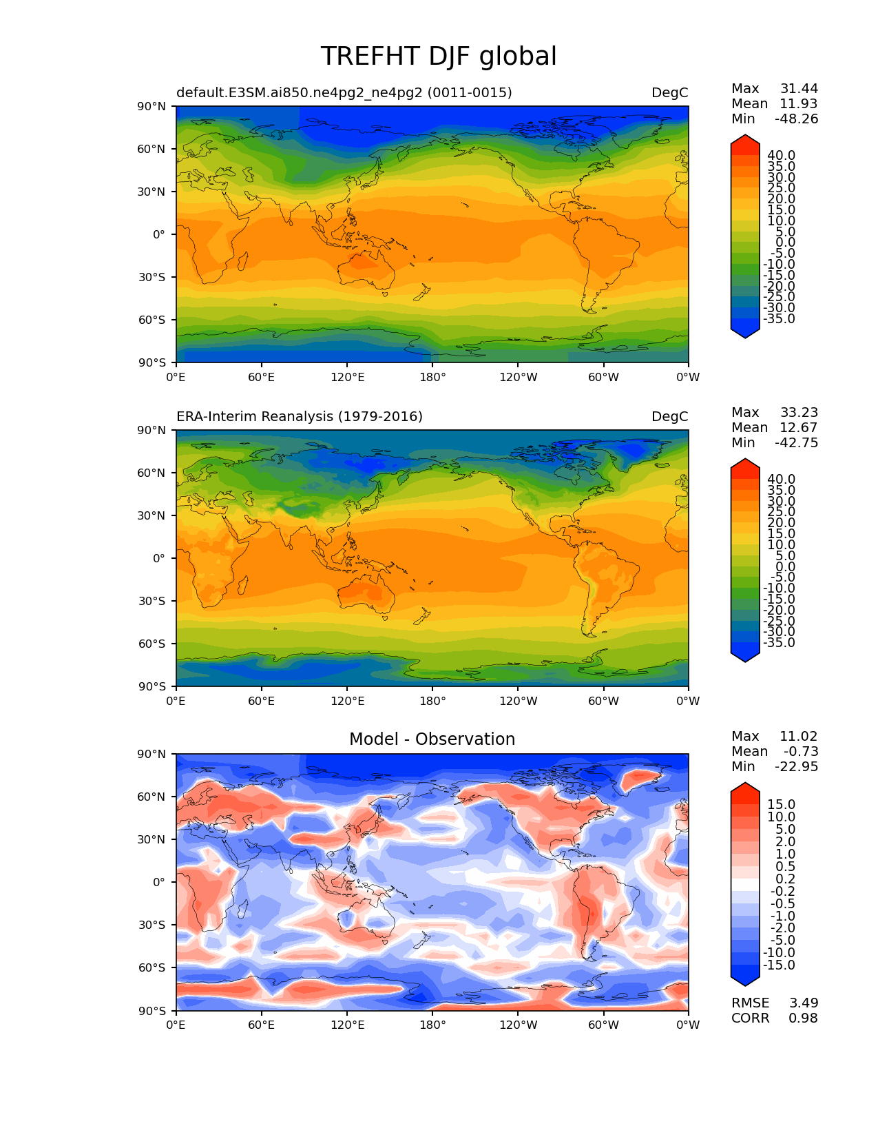 Use this command to recreate this image: | e3sm_diags lat_lon --no_viewer --case_id 'ERA-Interim' --sets 'lat_lon' --run_type 'model_vs_obs' --variables 'TREFHT' --seasons 'DJF' --regions 'global' --regrid_tool 'esmf' --regrid_method 'conservative' --main_title 'TREFHT DJF global' --backend 'mpl' --output_format 'png' --canvas_size_w '1212' --canvas_size_h '1628' --figsize '8.5' '11.0' --dpi '150' --arrows --contour_levels '-35' '-30' '-25' '-20' '-15' '-10' '-5' '0' '5' '10' '15' '20' '25' '30' '35' '40' --test_name 'default.E3SM.ai850.ne4pg2_ne4pg2' --test_colormap 'cet_rainbow.rgb' --ref_name 'ERA-Interim' --reference_name 'ERA-Interim Reanalysis' --reference_colormap 'cet_rainbow.rgb' --diff_title 'Model - Observation' --diff_colormap 'diverging_bwr.rgb' --diff_levels '-15' '-10' '-5' '-2' '-1' '-0.5' '-0.2' '0.2' '0.5' '1' '2' '5' '10' '15' --multiprocessing --num_workers '32' --granulate 'variables' 'seasons' 'plevs' 'regions' --selectors 'sets' 'seasons' --reference_data_path '/global/cfs/cdirs/e3sm/acme_diags/obs_for_e3sm_diags/climatology/' --test_data_path '/global/cfs/cdirs/e3sm/emulate/postproc_e3sm/slice/default.E3SM.ai850.ne4pg2_ne4pg2' --results_dir '/global/cfs/cdirs/e3sm/www/wagmanbe/slice/default.E3SM.ai850.ne4pg2_ne4pg2' |
