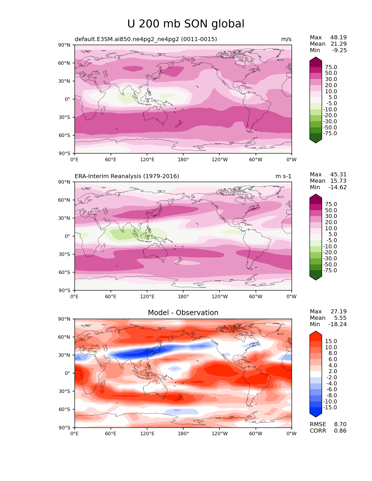 Use this command to recreate this image: | e3sm_diags lat_lon --no_viewer --case_id 'ERA-Interim' --sets 'lat_lon' --run_type 'model_vs_obs' --variables 'U' --seasons 'SON' --regions 'global' --regrid_tool 'esmf' --regrid_method 'conservative' --plevs '200.0' --main_title 'U 200 mb SON global' --backend 'mpl' --output_format 'png' --canvas_size_w '1212' --canvas_size_h '1628' --figsize '8.5' '11.0' --dpi '150' --arrows --contour_levels '-75' '-50' '-30' '-20' '-10' '-5' '5' '10' '20' '30' '50' '75' --test_name 'default.E3SM.ai850.ne4pg2_ne4pg2' --test_colormap 'PiYG_r' --ref_name 'ERA-Interim' --reference_name 'ERA-Interim Reanalysis' --reference_colormap 'PiYG_r' --diff_title 'Model - Observation' --diff_colormap 'diverging_bwr.rgb' --diff_levels '-15' '-10' '-8' '-6' '-4' '-2' '2' '4' '6' '8' '10' '15' --multiprocessing --num_workers '32' --granulate 'variables' 'seasons' 'plevs' 'regions' --selectors 'sets' 'seasons' --reference_data_path '/global/cfs/cdirs/e3sm/acme_diags/obs_for_e3sm_diags/climatology/' --test_data_path '/global/cfs/cdirs/e3sm/emulate/postproc_e3sm/slice/default.E3SM.ai850.ne4pg2_ne4pg2' --results_dir '/global/cfs/cdirs/e3sm/www/wagmanbe/slice/default.E3SM.ai850.ne4pg2_ne4pg2' |