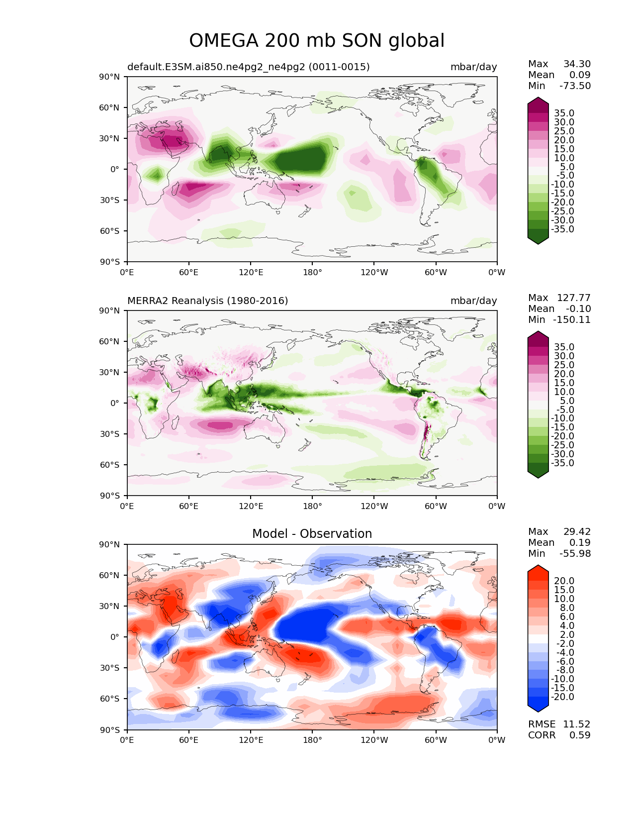 Use this command to recreate this image: | e3sm_diags lat_lon --no_viewer --case_id 'MERRA2' --sets 'lat_lon' --run_type 'model_vs_obs' --variables 'OMEGA' --seasons 'SON' --regions 'global' --regrid_tool 'esmf' --regrid_method 'conservative' --plevs '200.0' --main_title 'OMEGA 200 mb SON global' --backend 'mpl' --output_format 'png' --canvas_size_w '1212' --canvas_size_h '1628' --figsize '8.5' '11.0' --dpi '150' --arrows --contour_levels '-35' '-30' '-25' '-20' '-15' '-10' '-5' '5' '10' '15' '20' '25' '30' '35' --test_name 'default.E3SM.ai850.ne4pg2_ne4pg2' --test_colormap 'PiYG_r' --ref_name 'MERRA2' --reference_name 'MERRA2 Reanalysis' --reference_colormap 'PiYG_r' --diff_title 'Model - Observation' --diff_colormap 'diverging_bwr.rgb' --diff_levels '-20' '-15' '-10' '-8' '-6' '-4' '-2' '2' '4' '6' '8' '10' '15' '20' --multiprocessing --num_workers '32' --granulate 'variables' 'seasons' 'plevs' 'regions' --selectors 'sets' 'seasons' --reference_data_path '/global/cfs/cdirs/e3sm/acme_diags/obs_for_e3sm_diags/climatology/' --test_data_path '/global/cfs/cdirs/e3sm/emulate/postproc_e3sm/slice/default.E3SM.ai850.ne4pg2_ne4pg2' --results_dir '/global/cfs/cdirs/e3sm/www/wagmanbe/slice/default.E3SM.ai850.ne4pg2_ne4pg2' |