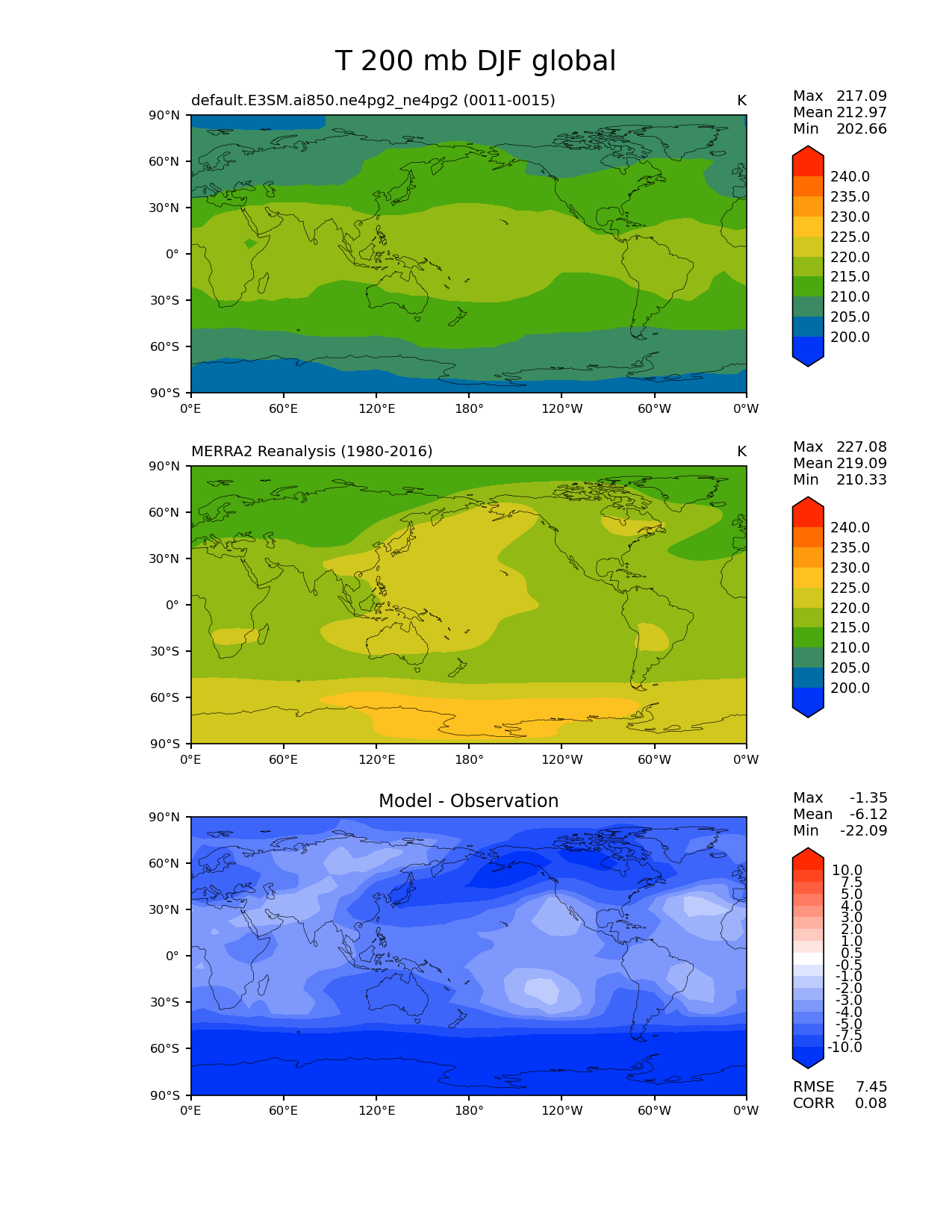 Use this command to recreate this image: | e3sm_diags lat_lon --no_viewer --case_id 'MERRA2' --sets 'lat_lon' --run_type 'model_vs_obs' --variables 'T' --seasons 'DJF' --regions 'global' --regrid_tool 'esmf' --regrid_method 'conservative' --plevs '200.0' --main_title 'T 200 mb DJF global' --backend 'mpl' --output_format 'png' --canvas_size_w '1212' --canvas_size_h '1628' --figsize '8.5' '11.0' --dpi '150' --arrows --contour_levels '200' '205' '210' '215' '220' '225' '230' '235' '240' --test_name 'default.E3SM.ai850.ne4pg2_ne4pg2' --test_colormap 'cet_rainbow.rgb' --ref_name 'MERRA2' --reference_name 'MERRA2 Reanalysis' --reference_colormap 'cet_rainbow.rgb' --diff_title 'Model - Observation' --diff_colormap 'diverging_bwr.rgb' --diff_levels '-10' '-7.5' '-5' '-4' '-3' '-2' '-1' '-0.5' '0.5' '1' '2' '3' '4' '5' '7.5' '10' --multiprocessing --num_workers '32' --granulate 'variables' 'seasons' 'plevs' 'regions' --selectors 'sets' 'seasons' --reference_data_path '/global/cfs/cdirs/e3sm/acme_diags/obs_for_e3sm_diags/climatology/' --test_data_path '/global/cfs/cdirs/e3sm/emulate/postproc_e3sm/slice/default.E3SM.ai850.ne4pg2_ne4pg2' --results_dir '/global/cfs/cdirs/e3sm/www/wagmanbe/slice/default.E3SM.ai850.ne4pg2_ne4pg2' |