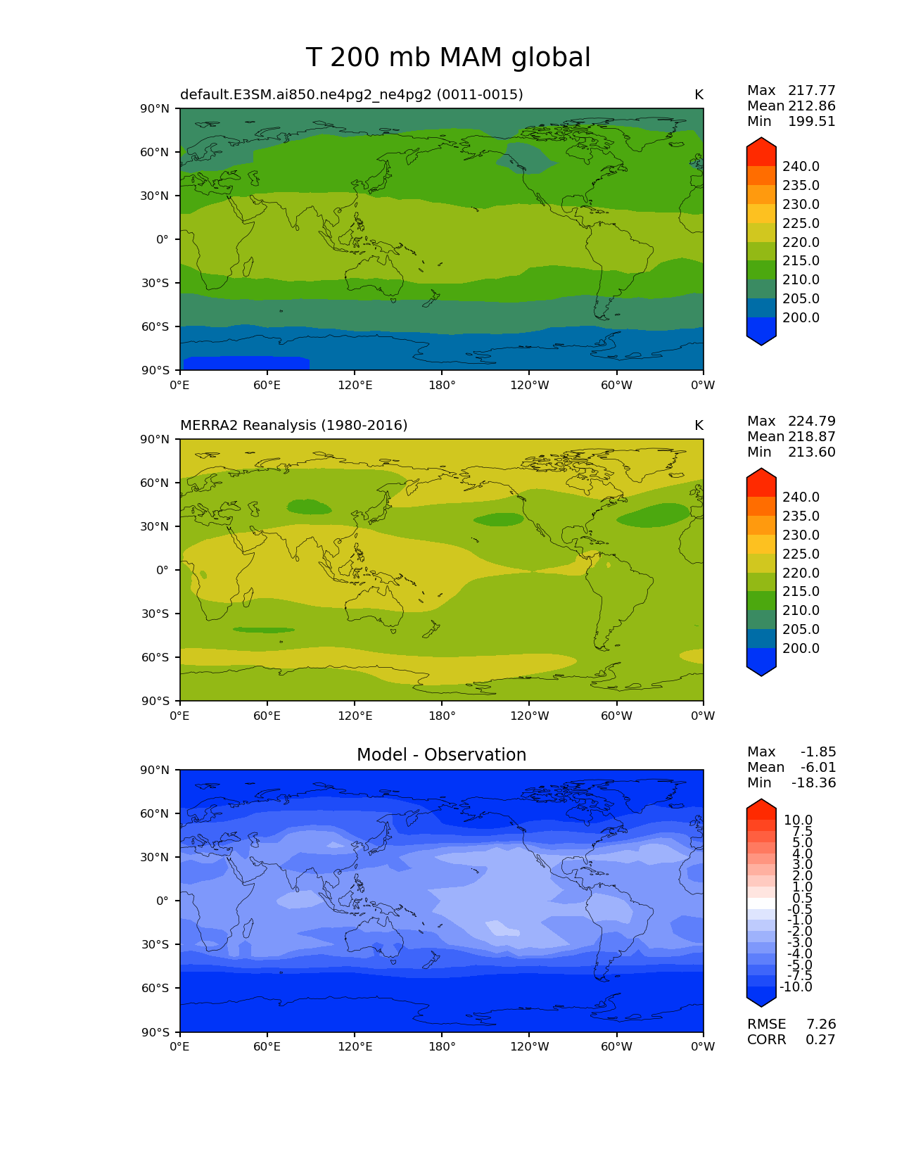 Use this command to recreate this image: | e3sm_diags lat_lon --no_viewer --case_id 'MERRA2' --sets 'lat_lon' --run_type 'model_vs_obs' --variables 'T' --seasons 'MAM' --regions 'global' --regrid_tool 'esmf' --regrid_method 'conservative' --plevs '200.0' --main_title 'T 200 mb MAM global' --backend 'mpl' --output_format 'png' --canvas_size_w '1212' --canvas_size_h '1628' --figsize '8.5' '11.0' --dpi '150' --arrows --contour_levels '200' '205' '210' '215' '220' '225' '230' '235' '240' --test_name 'default.E3SM.ai850.ne4pg2_ne4pg2' --test_colormap 'cet_rainbow.rgb' --ref_name 'MERRA2' --reference_name 'MERRA2 Reanalysis' --reference_colormap 'cet_rainbow.rgb' --diff_title 'Model - Observation' --diff_colormap 'diverging_bwr.rgb' --diff_levels '-10' '-7.5' '-5' '-4' '-3' '-2' '-1' '-0.5' '0.5' '1' '2' '3' '4' '5' '7.5' '10' --multiprocessing --num_workers '32' --granulate 'variables' 'seasons' 'plevs' 'regions' --selectors 'sets' 'seasons' --reference_data_path '/global/cfs/cdirs/e3sm/acme_diags/obs_for_e3sm_diags/climatology/' --test_data_path '/global/cfs/cdirs/e3sm/emulate/postproc_e3sm/slice/default.E3SM.ai850.ne4pg2_ne4pg2' --results_dir '/global/cfs/cdirs/e3sm/www/wagmanbe/slice/default.E3SM.ai850.ne4pg2_ne4pg2' |