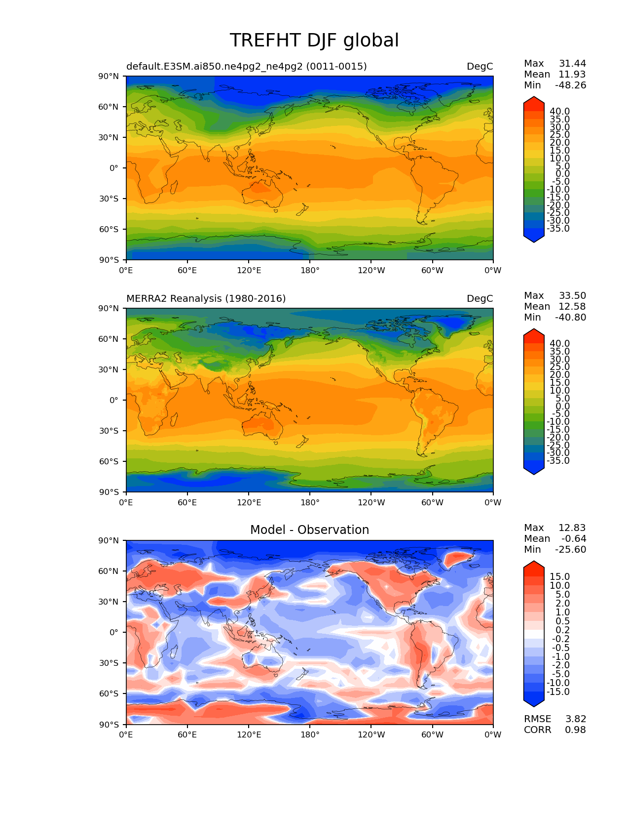 Use this command to recreate this image: | e3sm_diags lat_lon --no_viewer --case_id 'MERRA2' --sets 'lat_lon' --run_type 'model_vs_obs' --variables 'TREFHT' --seasons 'DJF' --regions 'global' --regrid_tool 'esmf' --regrid_method 'conservative' --main_title 'TREFHT DJF global' --backend 'mpl' --output_format 'png' --canvas_size_w '1212' --canvas_size_h '1628' --figsize '8.5' '11.0' --dpi '150' --arrows --contour_levels '-35' '-30' '-25' '-20' '-15' '-10' '-5' '0' '5' '10' '15' '20' '25' '30' '35' '40' --test_name 'default.E3SM.ai850.ne4pg2_ne4pg2' --test_colormap 'cet_rainbow.rgb' --ref_name 'MERRA2' --reference_name 'MERRA2 Reanalysis' --reference_colormap 'cet_rainbow.rgb' --diff_title 'Model - Observation' --diff_colormap 'diverging_bwr.rgb' --diff_levels '-15' '-10' '-5' '-2' '-1' '-0.5' '-0.2' '0.2' '0.5' '1' '2' '5' '10' '15' --multiprocessing --num_workers '32' --granulate 'variables' 'seasons' 'plevs' 'regions' --selectors 'sets' 'seasons' --reference_data_path '/global/cfs/cdirs/e3sm/acme_diags/obs_for_e3sm_diags/climatology/' --test_data_path '/global/cfs/cdirs/e3sm/emulate/postproc_e3sm/slice/default.E3SM.ai850.ne4pg2_ne4pg2' --results_dir '/global/cfs/cdirs/e3sm/www/wagmanbe/slice/default.E3SM.ai850.ne4pg2_ne4pg2' |