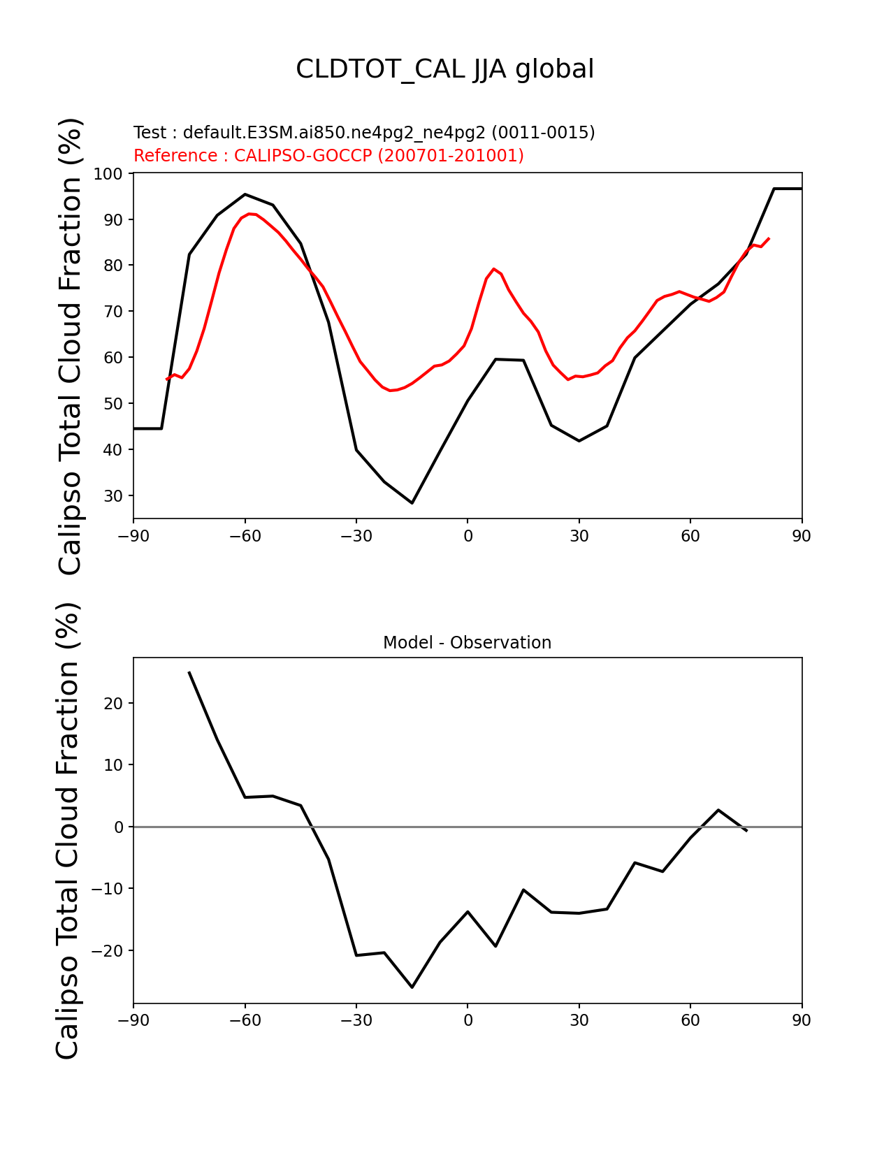Use this command to recreate this image: | e3sm_diags zonal_mean_xy --no_viewer --case_id 'Cloud Calipso' --sets 'zonal_mean_xy' --run_type 'model_vs_obs' --variables 'CLDTOT_CAL' --seasons 'JJA' --regions 'global' --regrid_tool 'esmf' --regrid_method 'conservative' --main_title 'CLDTOT_CAL JJA global' --backend 'mpl' --output_format 'png' --canvas_size_w '1212' --canvas_size_h '1628' --figsize '8.5' '11.0' --dpi '150' --arrows --test_name 'default.E3SM.ai850.ne4pg2_ne4pg2' --test_colormap 'cet_rainbow.rgb' --ref_name 'CALIPSOCOSP' --reference_name 'CALIPSO-GOCCP' --reference_colormap 'cet_rainbow.rgb' --diff_title 'Model - Observation' --diff_colormap 'diverging_bwr.rgb' --multiprocessing --num_workers '32' --granulate 'variables' 'seasons' 'plevs' 'regions' --selectors 'sets' 'seasons' --reference_data_path '/global/cfs/cdirs/e3sm/acme_diags/obs_for_e3sm_diags/climatology/' --test_data_path '/global/cfs/cdirs/e3sm/emulate/postproc_e3sm/slice/default.E3SM.ai850.ne4pg2_ne4pg2' --results_dir '/global/cfs/cdirs/e3sm/www/wagmanbe/slice/default.E3SM.ai850.ne4pg2_ne4pg2' |