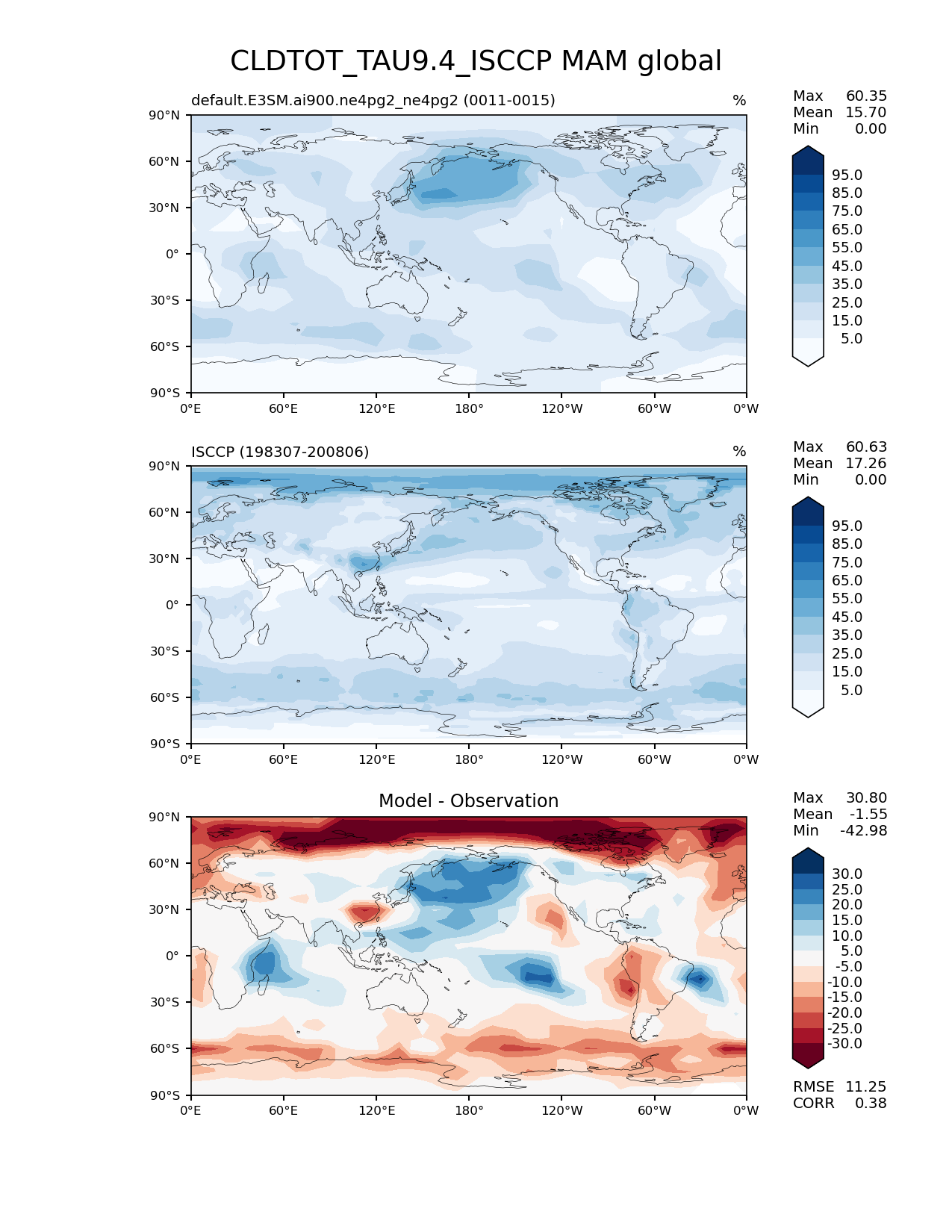 Use this command to recreate this image: | e3sm_diags lat_lon --no_viewer --case_id 'Cloud ISCCP' --sets 'lat_lon' --run_type 'model_vs_obs' --variables 'CLDTOT_TAU9.4_ISCCP' --seasons 'MAM' --regions 'global' --regrid_tool 'esmf' --regrid_method 'conservative' --main_title 'CLDTOT_TAU9.4_ISCCP MAM global' --backend 'mpl' --output_format 'png' --canvas_size_w '1212' --canvas_size_h '1628' --figsize '8.5' '11.0' --dpi '150' --arrows --contour_levels '5' '15' '25' '35' '45' '55' '65' '75' '85' '95' --test_name 'default.E3SM.ai900.ne4pg2_ne4pg2' --test_colormap 'Blues' --ref_name 'ISCCPCOSP' --reference_name 'ISCCP' --reference_colormap 'Blues' --diff_title 'Model - Observation' --diff_colormap 'RdBu' --diff_levels '-30' '-25' '-20' '-15' '-10' '-5' '5' '10' '15' '20' '25' '30' --multiprocessing --num_workers '32' --granulate 'variables' 'seasons' 'plevs' 'regions' --selectors 'sets' 'seasons' --reference_data_path '/global/cfs/cdirs/e3sm/acme_diags/obs_for_e3sm_diags/climatology/' --test_data_path '/global/cfs/cdirs/e3sm/emulate/postproc_e3sm/slice/default.E3SM.ai900.ne4pg2_ne4pg2' --results_dir '/global/cfs/cdirs/e3sm/www/wagmanbe/slice/default.E3SM.ai900.ne4pg2_ne4pg2' |