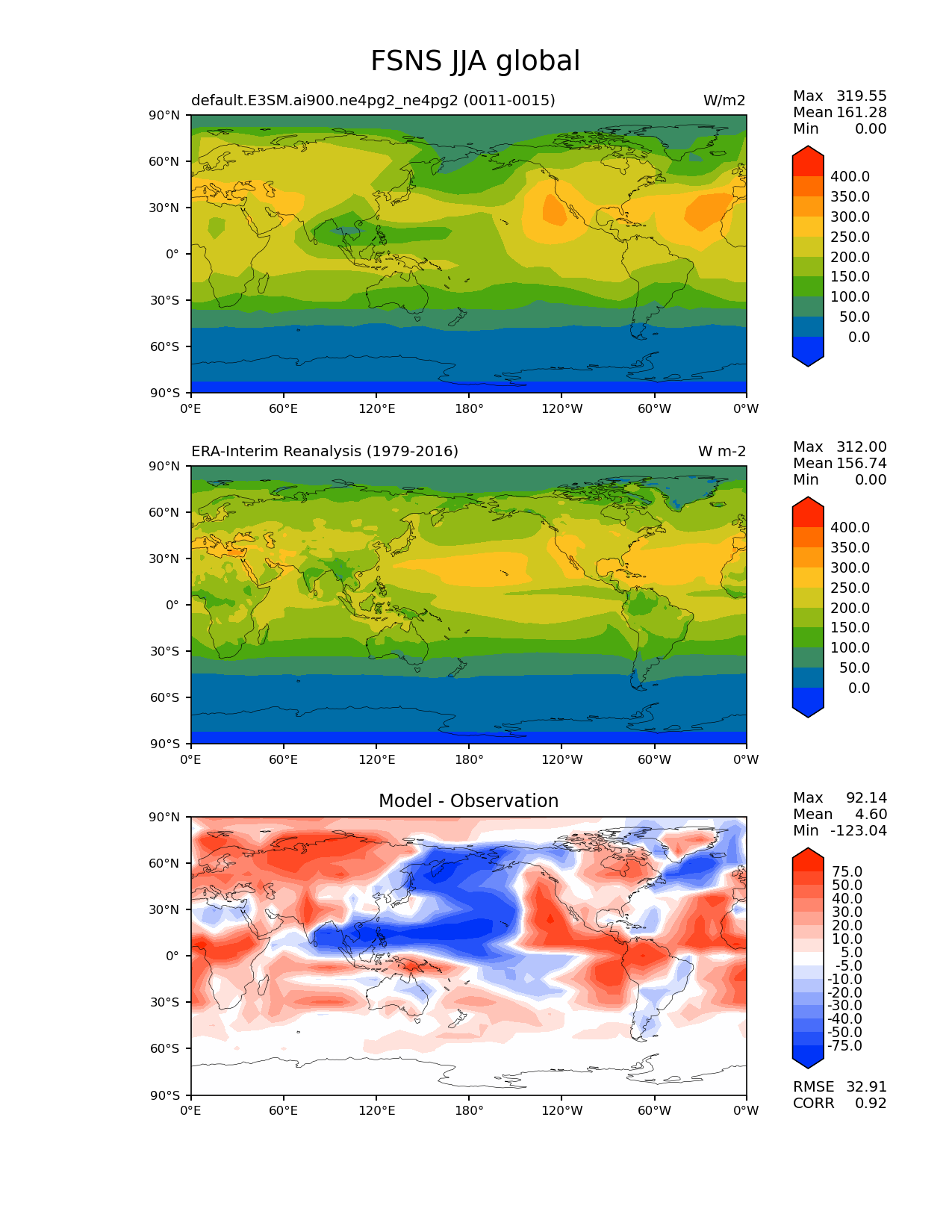 Use this command to recreate this image: | e3sm_diags lat_lon --no_viewer --case_id 'ERA-Interim' --sets 'lat_lon' --run_type 'model_vs_obs' --variables 'FSNS' --seasons 'JJA' --regions 'global' --regrid_tool 'esmf' --regrid_method 'conservative' --main_title 'FSNS JJA global' --backend 'mpl' --output_format 'png' --canvas_size_w '1212' --canvas_size_h '1628' --figsize '8.5' '11.0' --dpi '150' --arrows --contour_levels '0' '50' '100' '150' '200' '250' '300' '350' '400' --test_name 'default.E3SM.ai900.ne4pg2_ne4pg2' --test_colormap 'cet_rainbow.rgb' --ref_name 'ERA-Interim' --reference_name 'ERA-Interim Reanalysis' --reference_colormap 'cet_rainbow.rgb' --diff_title 'Model - Observation' --diff_colormap 'diverging_bwr.rgb' --diff_levels '-75' '-50' '-40' '-30' '-20' '-10' '-5' '5' '10' '20' '30' '40' '50' '75' --multiprocessing --num_workers '32' --granulate 'variables' 'seasons' 'plevs' 'regions' --selectors 'sets' 'seasons' --reference_data_path '/global/cfs/cdirs/e3sm/acme_diags/obs_for_e3sm_diags/climatology/' --test_data_path '/global/cfs/cdirs/e3sm/emulate/postproc_e3sm/slice/default.E3SM.ai900.ne4pg2_ne4pg2' --results_dir '/global/cfs/cdirs/e3sm/www/wagmanbe/slice/default.E3SM.ai900.ne4pg2_ne4pg2' |
