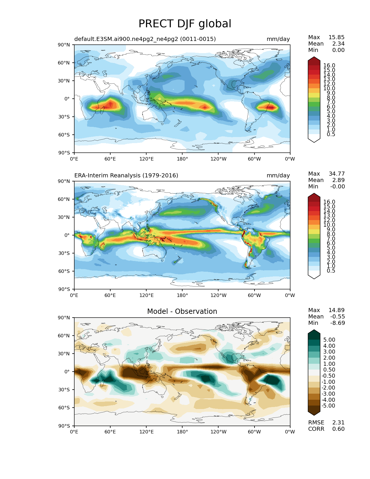 Use this command to recreate this image: | e3sm_diags lat_lon --no_viewer --case_id 'ERA-Interim' --sets 'lat_lon' --run_type 'model_vs_obs' --variables 'PRECT' --seasons 'DJF' --regions 'global' --regrid_tool 'esmf' --regrid_method 'conservative' --main_title 'PRECT DJF global' --backend 'mpl' --output_format 'png' --canvas_size_w '1212' --canvas_size_h '1628' --figsize '8.5' '11.0' --dpi '150' --arrows --contour_levels '0.5' '1' '2' '3' '4' '5' '6' '7' '8' '9' '10' '12' '13' '14' '15' '16' --test_name 'default.E3SM.ai900.ne4pg2_ne4pg2' --test_colormap 'WhiteBlueGreenYellowRed.rgb' --ref_name 'ERA-Interim' --reference_name 'ERA-Interim Reanalysis' --reference_colormap 'WhiteBlueGreenYellowRed.rgb' --diff_title 'Model - Observation' --diff_colormap 'BrBG' --diff_levels '-5' '-4' '-3' '-2' '-1' '-0.5' '0.5' '1' '2' '3' '4' '5' --multiprocessing --num_workers '32' --granulate 'variables' 'seasons' 'plevs' 'regions' --selectors 'sets' 'seasons' --reference_data_path '/global/cfs/cdirs/e3sm/acme_diags/obs_for_e3sm_diags/climatology/' --test_data_path '/global/cfs/cdirs/e3sm/emulate/postproc_e3sm/slice/default.E3SM.ai900.ne4pg2_ne4pg2' --results_dir '/global/cfs/cdirs/e3sm/www/wagmanbe/slice/default.E3SM.ai900.ne4pg2_ne4pg2' |