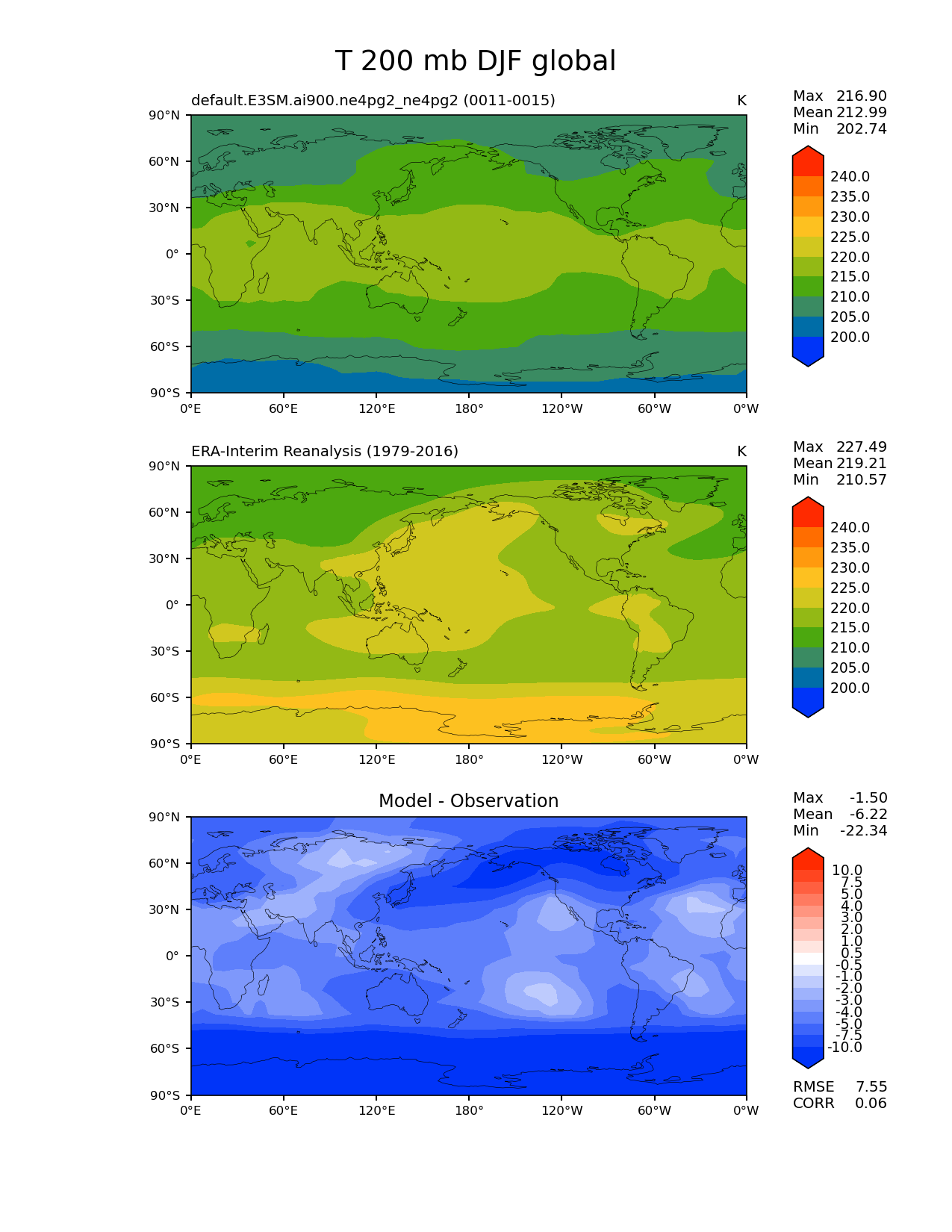 Use this command to recreate this image: | e3sm_diags lat_lon --no_viewer --case_id 'ERA-Interim' --sets 'lat_lon' --run_type 'model_vs_obs' --variables 'T' --seasons 'DJF' --regions 'global' --regrid_tool 'esmf' --regrid_method 'conservative' --plevs '200.0' --main_title 'T 200 mb DJF global' --backend 'mpl' --output_format 'png' --canvas_size_w '1212' --canvas_size_h '1628' --figsize '8.5' '11.0' --dpi '150' --arrows --contour_levels '200' '205' '210' '215' '220' '225' '230' '235' '240' --test_name 'default.E3SM.ai900.ne4pg2_ne4pg2' --test_colormap 'cet_rainbow.rgb' --ref_name 'ERA-Interim' --reference_name 'ERA-Interim Reanalysis' --reference_colormap 'cet_rainbow.rgb' --diff_title 'Model - Observation' --diff_colormap 'diverging_bwr.rgb' --diff_levels '-10' '-7.5' '-5' '-4' '-3' '-2' '-1' '-0.5' '0.5' '1' '2' '3' '4' '5' '7.5' '10' --multiprocessing --num_workers '32' --granulate 'variables' 'seasons' 'plevs' 'regions' --selectors 'sets' 'seasons' --reference_data_path '/global/cfs/cdirs/e3sm/acme_diags/obs_for_e3sm_diags/climatology/' --test_data_path '/global/cfs/cdirs/e3sm/emulate/postproc_e3sm/slice/default.E3SM.ai900.ne4pg2_ne4pg2' --results_dir '/global/cfs/cdirs/e3sm/www/wagmanbe/slice/default.E3SM.ai900.ne4pg2_ne4pg2' |