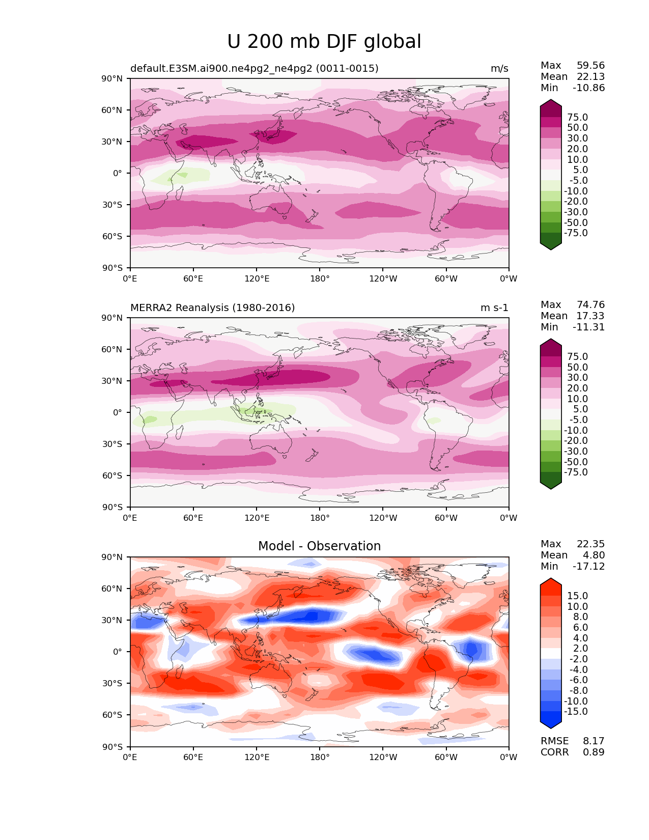 Use this command to recreate this image: | e3sm_diags lat_lon --no_viewer --case_id 'MERRA2' --sets 'lat_lon' --run_type 'model_vs_obs' --variables 'U' --seasons 'DJF' --regions 'global' --regrid_tool 'esmf' --regrid_method 'conservative' --plevs '200.0' --main_title 'U 200 mb DJF global' --backend 'mpl' --output_format 'png' --canvas_size_w '1212' --canvas_size_h '1628' --figsize '8.5' '11.0' --dpi '150' --arrows --contour_levels '-75' '-50' '-30' '-20' '-10' '-5' '5' '10' '20' '30' '50' '75' --test_name 'default.E3SM.ai900.ne4pg2_ne4pg2' --test_colormap 'PiYG_r' --ref_name 'MERRA2' --reference_name 'MERRA2 Reanalysis' --reference_colormap 'PiYG_r' --diff_title 'Model - Observation' --diff_colormap 'diverging_bwr.rgb' --diff_levels '-15' '-10' '-8' '-6' '-4' '-2' '2' '4' '6' '8' '10' '15' --multiprocessing --num_workers '32' --granulate 'variables' 'seasons' 'plevs' 'regions' --selectors 'sets' 'seasons' --reference_data_path '/global/cfs/cdirs/e3sm/acme_diags/obs_for_e3sm_diags/climatology/' --test_data_path '/global/cfs/cdirs/e3sm/emulate/postproc_e3sm/slice/default.E3SM.ai900.ne4pg2_ne4pg2' --results_dir '/global/cfs/cdirs/e3sm/www/wagmanbe/slice/default.E3SM.ai900.ne4pg2_ne4pg2' |