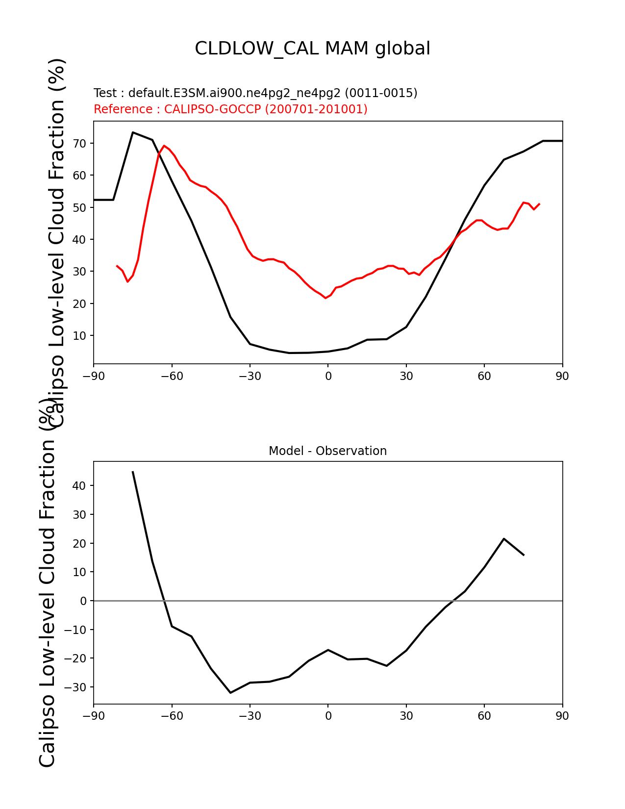 Use this command to recreate this image: | e3sm_diags zonal_mean_xy --no_viewer --case_id 'Cloud Calipso' --sets 'zonal_mean_xy' --run_type 'model_vs_obs' --variables 'CLDLOW_CAL' --seasons 'MAM' --regions 'global' --regrid_tool 'esmf' --regrid_method 'conservative' --main_title 'CLDLOW_CAL MAM global' --backend 'mpl' --output_format 'png' --canvas_size_w '1212' --canvas_size_h '1628' --figsize '8.5' '11.0' --dpi '150' --arrows --test_name 'default.E3SM.ai900.ne4pg2_ne4pg2' --test_colormap 'cet_rainbow.rgb' --ref_name 'CALIPSOCOSP' --reference_name 'CALIPSO-GOCCP' --reference_colormap 'cet_rainbow.rgb' --diff_title 'Model - Observation' --diff_colormap 'diverging_bwr.rgb' --multiprocessing --num_workers '32' --granulate 'variables' 'seasons' 'plevs' 'regions' --selectors 'sets' 'seasons' --reference_data_path '/global/cfs/cdirs/e3sm/acme_diags/obs_for_e3sm_diags/climatology/' --test_data_path '/global/cfs/cdirs/e3sm/emulate/postproc_e3sm/slice/default.E3SM.ai900.ne4pg2_ne4pg2' --results_dir '/global/cfs/cdirs/e3sm/www/wagmanbe/slice/default.E3SM.ai900.ne4pg2_ne4pg2' |