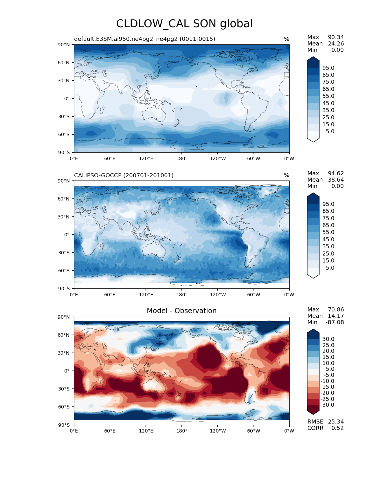 Use this command to recreate this image: | e3sm_diags lat_lon --no_viewer --case_id 'Cloud Calipso' --sets 'lat_lon' --run_type 'model_vs_obs' --variables 'CLDLOW_CAL' --seasons 'SON' --regions 'global' --regrid_tool 'esmf' --regrid_method 'conservative' --main_title 'CLDLOW_CAL SON global' --backend 'mpl' --output_format 'png' --canvas_size_w '1212' --canvas_size_h '1628' --figsize '8.5' '11.0' --dpi '150' --arrows --contour_levels '5' '15' '25' '35' '45' '55' '65' '75' '85' '95' --test_name 'default.E3SM.ai950.ne4pg2_ne4pg2' --test_colormap 'Blues' --ref_name 'CALIPSOCOSP' --reference_name 'CALIPSO-GOCCP' --reference_colormap 'Blues' --diff_title 'Model - Observation' --diff_colormap 'RdBu' --diff_levels '-30' '-25' '-20' '-15' '-10' '-5' '5' '10' '15' '20' '25' '30' --multiprocessing --num_workers '32' --granulate 'variables' 'seasons' 'plevs' 'regions' --selectors 'sets' 'seasons' --reference_data_path '/global/cfs/cdirs/e3sm/acme_diags/obs_for_e3sm_diags/climatology/' --test_data_path '/global/cfs/cdirs/e3sm/emulate/postproc_e3sm/slice/default.E3SM.ai950.ne4pg2_ne4pg2' --results_dir '/global/cfs/cdirs/e3sm/www/wagmanbe/slice/default.E3SM.ai950.ne4pg2_ne4pg2' |