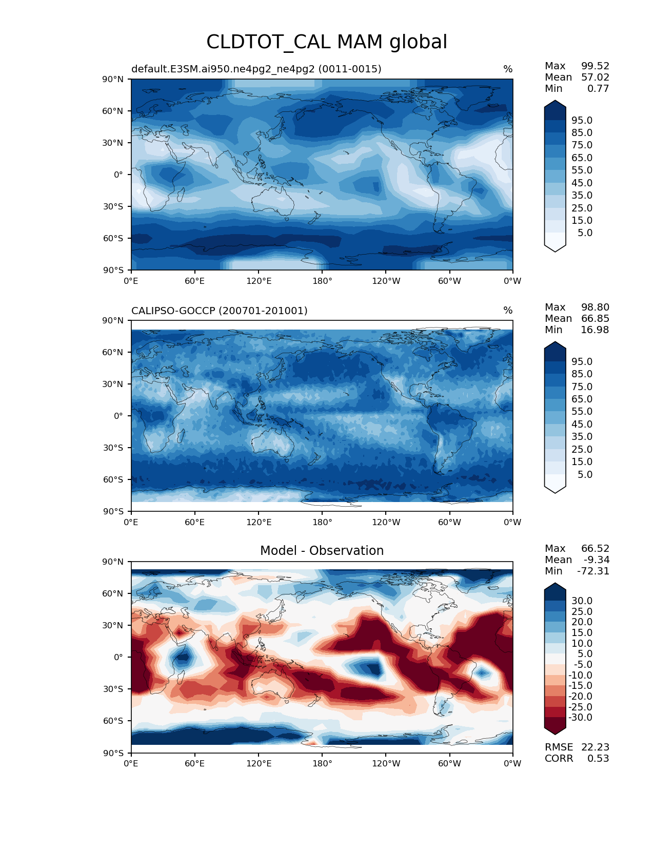 Use this command to recreate this image: | e3sm_diags lat_lon --no_viewer --case_id 'Cloud Calipso' --sets 'lat_lon' --run_type 'model_vs_obs' --variables 'CLDTOT_CAL' --seasons 'MAM' --regions 'global' --regrid_tool 'esmf' --regrid_method 'conservative' --main_title 'CLDTOT_CAL MAM global' --backend 'mpl' --output_format 'png' --canvas_size_w '1212' --canvas_size_h '1628' --figsize '8.5' '11.0' --dpi '150' --arrows --contour_levels '5' '15' '25' '35' '45' '55' '65' '75' '85' '95' --test_name 'default.E3SM.ai950.ne4pg2_ne4pg2' --test_colormap 'Blues' --ref_name 'CALIPSOCOSP' --reference_name 'CALIPSO-GOCCP' --reference_colormap 'Blues' --diff_title 'Model - Observation' --diff_colormap 'RdBu' --diff_levels '-30' '-25' '-20' '-15' '-10' '-5' '5' '10' '15' '20' '25' '30' --multiprocessing --num_workers '32' --granulate 'variables' 'seasons' 'plevs' 'regions' --selectors 'sets' 'seasons' --reference_data_path '/global/cfs/cdirs/e3sm/acme_diags/obs_for_e3sm_diags/climatology/' --test_data_path '/global/cfs/cdirs/e3sm/emulate/postproc_e3sm/slice/default.E3SM.ai950.ne4pg2_ne4pg2' --results_dir '/global/cfs/cdirs/e3sm/www/wagmanbe/slice/default.E3SM.ai950.ne4pg2_ne4pg2' |