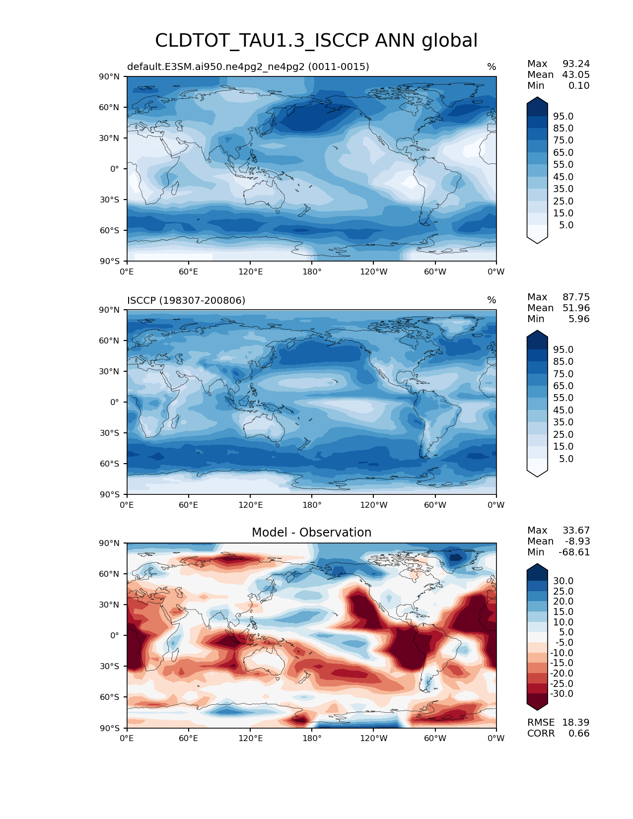 Use this command to recreate this image: | e3sm_diags lat_lon --no_viewer --case_id 'Cloud ISCCP' --sets 'lat_lon' --run_type 'model_vs_obs' --variables 'CLDTOT_TAU1.3_ISCCP' --seasons 'ANN' --regions 'global' --regrid_tool 'esmf' --regrid_method 'conservative' --main_title 'CLDTOT_TAU1.3_ISCCP ANN global' --backend 'mpl' --output_format 'png' --canvas_size_w '1212' --canvas_size_h '1628' --figsize '8.5' '11.0' --dpi '150' --arrows --contour_levels '5' '15' '25' '35' '45' '55' '65' '75' '85' '95' --test_name 'default.E3SM.ai950.ne4pg2_ne4pg2' --test_colormap 'Blues' --ref_name 'ISCCPCOSP' --reference_name 'ISCCP' --reference_colormap 'Blues' --diff_title 'Model - Observation' --diff_colormap 'RdBu' --diff_levels '-30' '-25' '-20' '-15' '-10' '-5' '5' '10' '15' '20' '25' '30' --multiprocessing --num_workers '32' --granulate 'variables' 'seasons' 'plevs' 'regions' --selectors 'sets' 'seasons' --reference_data_path '/global/cfs/cdirs/e3sm/acme_diags/obs_for_e3sm_diags/climatology/' --test_data_path '/global/cfs/cdirs/e3sm/emulate/postproc_e3sm/slice/default.E3SM.ai950.ne4pg2_ne4pg2' --results_dir '/global/cfs/cdirs/e3sm/www/wagmanbe/slice/default.E3SM.ai950.ne4pg2_ne4pg2' |