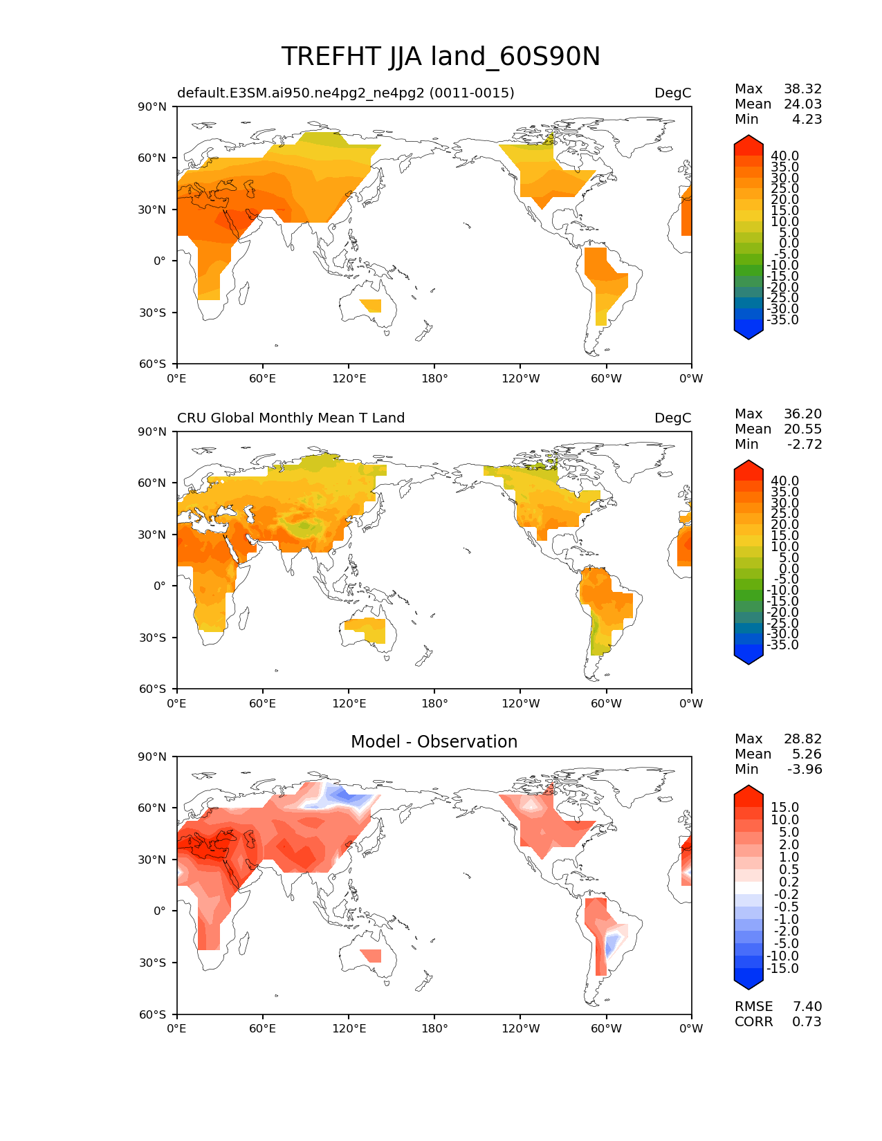 Use this command to recreate this image: | e3sm_diags lat_lon --no_viewer --case_id 'CRU_IPCC' --sets 'lat_lon' --run_type 'model_vs_obs' --variables 'TREFHT' --seasons 'JJA' --regions 'land_60S90N' --regrid_tool 'esmf' --regrid_method 'conservative' --main_title 'TREFHT JJA land_60S90N' --backend 'mpl' --output_format 'png' --canvas_size_w '1212' --canvas_size_h '1628' --figsize '8.5' '11.0' --dpi '150' --arrows --contour_levels '-35' '-30' '-25' '-20' '-15' '-10' '-5' '0' '5' '10' '15' '20' '25' '30' '35' '40' --test_name 'default.E3SM.ai950.ne4pg2_ne4pg2' --test_colormap 'cet_rainbow.rgb' --ref_name 'CRU' --reference_name 'CRU Global Monthly Mean T Land' --reference_colormap 'cet_rainbow.rgb' --diff_title 'Model - Observation' --diff_colormap 'diverging_bwr.rgb' --diff_levels '-15' '-10' '-5' '-2' '-1' '-0.5' '-0.2' '0.2' '0.5' '1' '2' '5' '10' '15' --multiprocessing --num_workers '32' --granulate 'variables' 'seasons' 'plevs' 'regions' --selectors 'sets' 'seasons' --reference_data_path '/global/cfs/cdirs/e3sm/acme_diags/obs_for_e3sm_diags/climatology/' --test_data_path '/global/cfs/cdirs/e3sm/emulate/postproc_e3sm/slice/default.E3SM.ai950.ne4pg2_ne4pg2' --results_dir '/global/cfs/cdirs/e3sm/www/wagmanbe/slice/default.E3SM.ai950.ne4pg2_ne4pg2' |