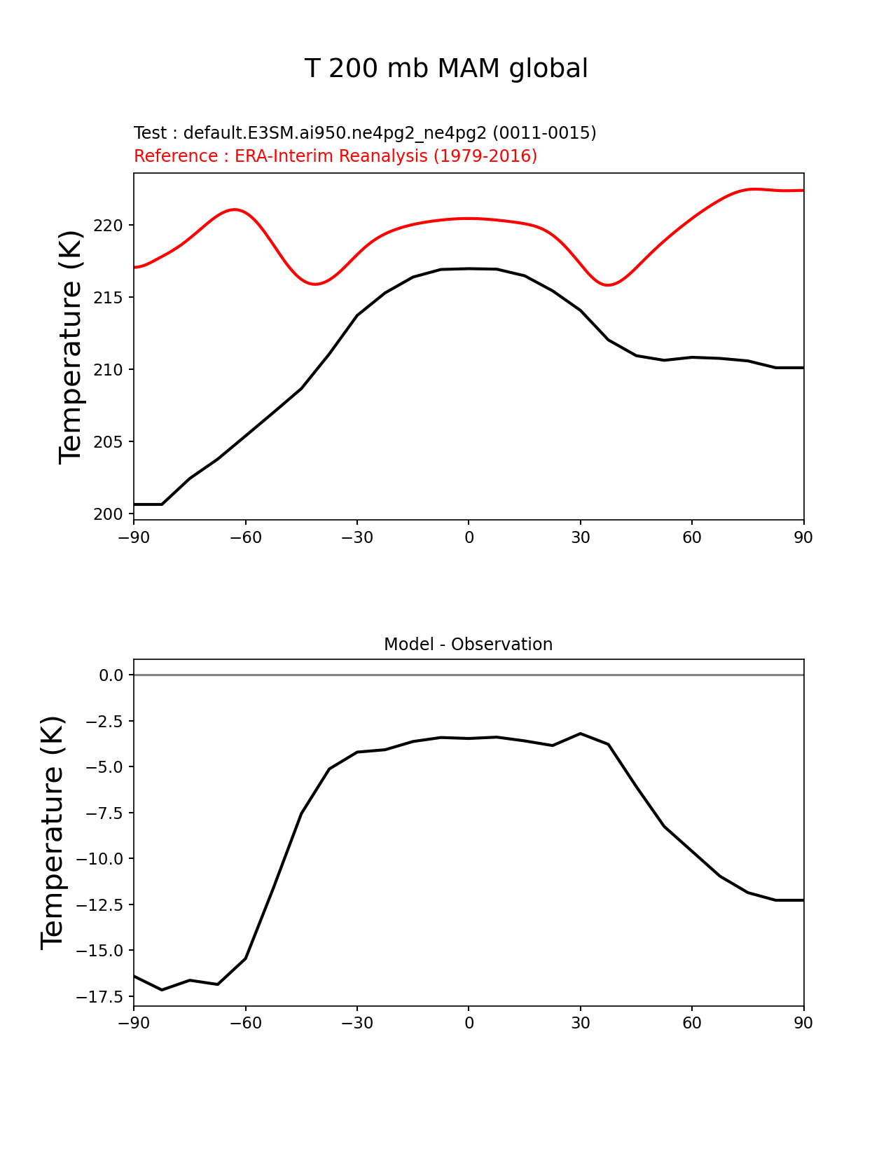 Use this command to recreate this image: | e3sm_diags zonal_mean_xy --no_viewer --case_id 'ERA-Interim' --sets 'zonal_mean_xy' --run_type 'model_vs_obs' --variables 'T' --seasons 'MAM' --regions 'global' --regrid_tool 'esmf' --regrid_method 'conservative' --plevs '200.0' --main_title 'T 200 mb MAM global' --backend 'mpl' --output_format 'png' --canvas_size_w '1212' --canvas_size_h '1628' --figsize '8.5' '11.0' --dpi '150' --arrows --test_name 'default.E3SM.ai950.ne4pg2_ne4pg2' --test_colormap 'cet_rainbow.rgb' --ref_name 'ERA-Interim' --reference_name 'ERA-Interim Reanalysis' --reference_colormap 'cet_rainbow.rgb' --diff_title 'Model - Observation' --diff_colormap 'diverging_bwr.rgb' --multiprocessing --num_workers '32' --granulate 'variables' 'seasons' 'plevs' 'regions' --selectors 'sets' 'seasons' --reference_data_path '/global/cfs/cdirs/e3sm/acme_diags/obs_for_e3sm_diags/climatology/' --test_data_path '/global/cfs/cdirs/e3sm/emulate/postproc_e3sm/slice/default.E3SM.ai950.ne4pg2_ne4pg2' --results_dir '/global/cfs/cdirs/e3sm/www/wagmanbe/slice/default.E3SM.ai950.ne4pg2_ne4pg2' |