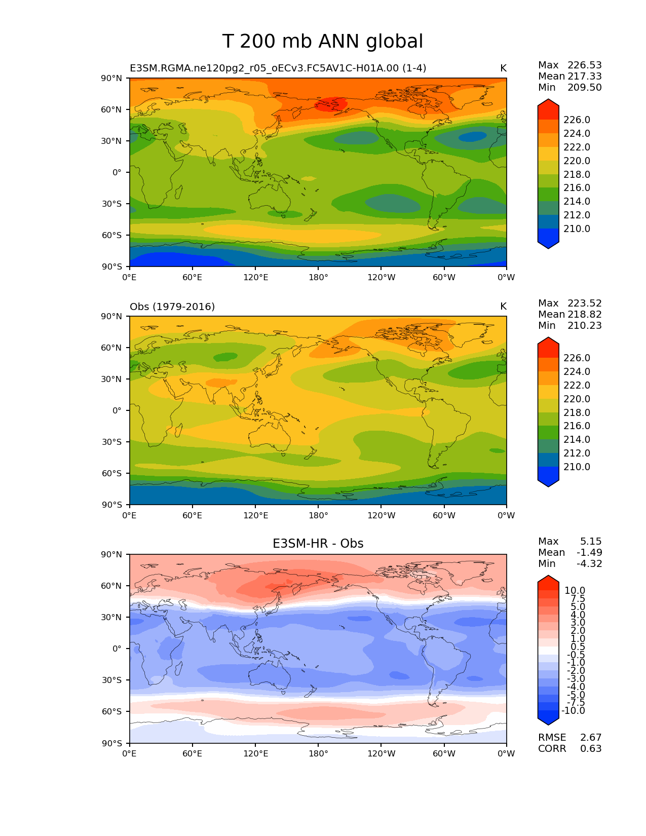 Use this command to recreate this image: | e3sm_diags lat_lon --no_viewer --case_id 'ERA-Interim' --sets 'lat_lon' --run_type 'model_vs_obs' --variables 'T' --seasons 'ANN' --regions 'global' --regrid_tool 'esmf' --regrid_method 'conservative' --plevs '200.0' --main_title 'T 200 mb ANN global' --backend 'mpl' --output_format 'png' --canvas_size_w '1212' --canvas_size_h '1628' --figsize '8.5' '11.0' --dpi '150' --arrows --contour_levels '210' '212' '214' '216' '218' '220' '222' '224' '226' --test_name 'E3SM.RGMA.ne120pg2_r05_oECv3.FC5AV1C-H01A.00' --test_colormap 'cet_rainbow.rgb' --ref_name 'ERA-Interim' --reference_name 'Obs' --reference_colormap 'cet_rainbow.rgb' --diff_title 'E3SM-HR - Obs' --diff_colormap 'diverging_bwr.rgb' --diff_levels '-10' '-7.5' '-5' '-4' '-3' '-2' '-1' '-0.5' '0.5' '1' '2' '3' '4' '5' '7.5' '10' --multiprocessing --num_workers '30' --granulate 'variables' 'seasons' 'plevs' 'regions' --selectors 'sets' 'seasons' --results_dir '/global/cscratch1/sd/whannah/diags_tmp/RGMA/E3SM-HR_vs_Obs' --reference_data_path '/global/cfs/cdirs/e3sm/acme_diags/obs_for_e3sm_diags/climatology/' --test_data_path '/global/cscratch1/sd/whannah/e3sm_scratch/cori-knl/E3SM.RGMA.ne120pg2_r05_oECv3.FC5AV1C-H01A.00/clim/' |