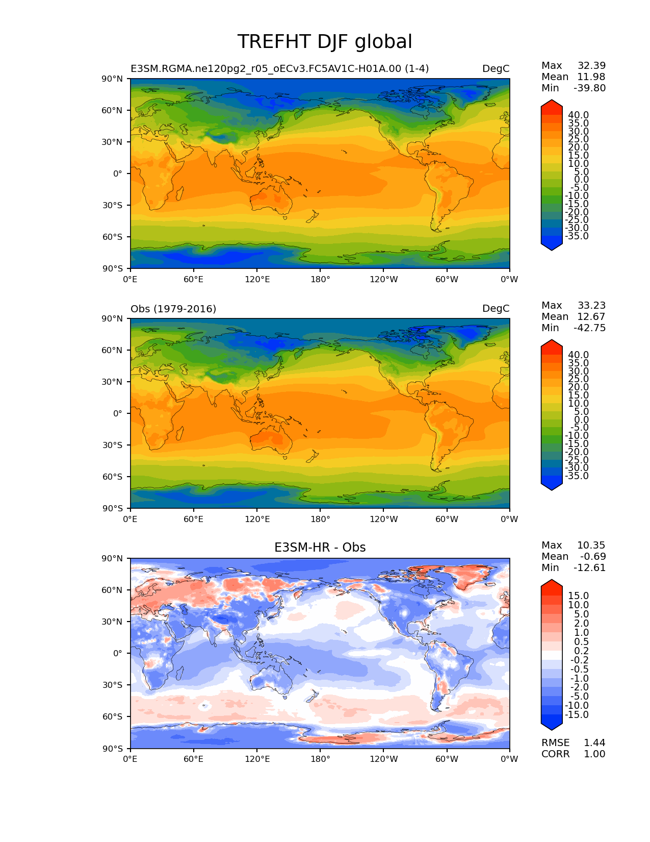 Use this command to recreate this image: | e3sm_diags lat_lon --no_viewer --case_id 'ERA-Interim' --sets 'lat_lon' --run_type 'model_vs_obs' --variables 'TREFHT' --seasons 'DJF' --regions 'global' --regrid_tool 'esmf' --regrid_method 'conservative' --main_title 'TREFHT DJF global' --backend 'mpl' --output_format 'png' --canvas_size_w '1212' --canvas_size_h '1628' --figsize '8.5' '11.0' --dpi '150' --arrows --contour_levels '-35' '-30' '-25' '-20' '-15' '-10' '-5' '0' '5' '10' '15' '20' '25' '30' '35' '40' --test_name 'E3SM.RGMA.ne120pg2_r05_oECv3.FC5AV1C-H01A.00' --test_colormap 'cet_rainbow.rgb' --ref_name 'ERA-Interim' --reference_name 'Obs' --reference_colormap 'cet_rainbow.rgb' --diff_title 'E3SM-HR - Obs' --diff_colormap 'diverging_bwr.rgb' --diff_levels '-15' '-10' '-5' '-2' '-1' '-0.5' '-0.2' '0.2' '0.5' '1' '2' '5' '10' '15' --multiprocessing --num_workers '30' --granulate 'variables' 'seasons' 'plevs' 'regions' --selectors 'sets' 'seasons' --results_dir '/global/cscratch1/sd/whannah/diags_tmp/RGMA/E3SM-HR_vs_Obs' --reference_data_path '/global/cfs/cdirs/e3sm/acme_diags/obs_for_e3sm_diags/climatology/' --test_data_path '/global/cscratch1/sd/whannah/e3sm_scratch/cori-knl/E3SM.RGMA.ne120pg2_r05_oECv3.FC5AV1C-H01A.00/clim/' |