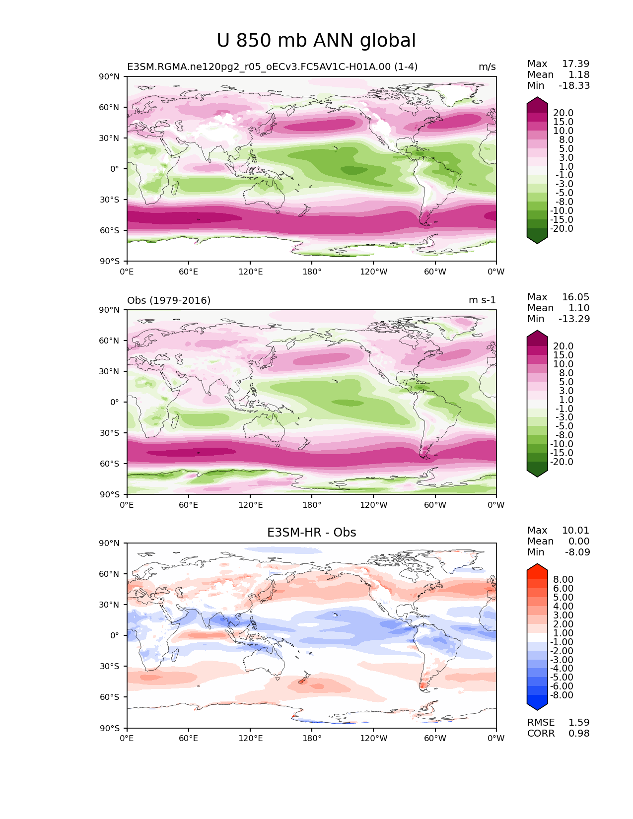 Use this command to recreate this image: | e3sm_diags lat_lon --no_viewer --case_id 'ERA-Interim' --sets 'lat_lon' --run_type 'model_vs_obs' --variables 'U' --seasons 'ANN' --regions 'global' --regrid_tool 'esmf' --regrid_method 'conservative' --plevs '850.0' --main_title 'U 850 mb ANN global' --backend 'mpl' --output_format 'png' --canvas_size_w '1212' --canvas_size_h '1628' --figsize '8.5' '11.0' --dpi '150' --arrows --contour_levels '-20' '-15' '-10' '-8' '-5' '-3' '-1' '1' '3' '5' '8' '10' '15' '20' --test_name 'E3SM.RGMA.ne120pg2_r05_oECv3.FC5AV1C-H01A.00' --test_colormap 'PiYG_r' --ref_name 'ERA-Interim' --reference_name 'Obs' --reference_colormap 'PiYG_r' --diff_title 'E3SM-HR - Obs' --diff_colormap 'diverging_bwr.rgb' --diff_levels '-8' '-6' '-5' '-4' '-3' '-2' '-1' '1' '2' '3' '4' '5' '6' '8' --multiprocessing --num_workers '30' --granulate 'variables' 'seasons' 'plevs' 'regions' --selectors 'sets' 'seasons' --results_dir '/global/cscratch1/sd/whannah/diags_tmp/RGMA/E3SM-HR_vs_Obs' --reference_data_path '/global/cfs/cdirs/e3sm/acme_diags/obs_for_e3sm_diags/climatology/' --test_data_path '/global/cscratch1/sd/whannah/e3sm_scratch/cori-knl/E3SM.RGMA.ne120pg2_r05_oECv3.FC5AV1C-H01A.00/clim/' |