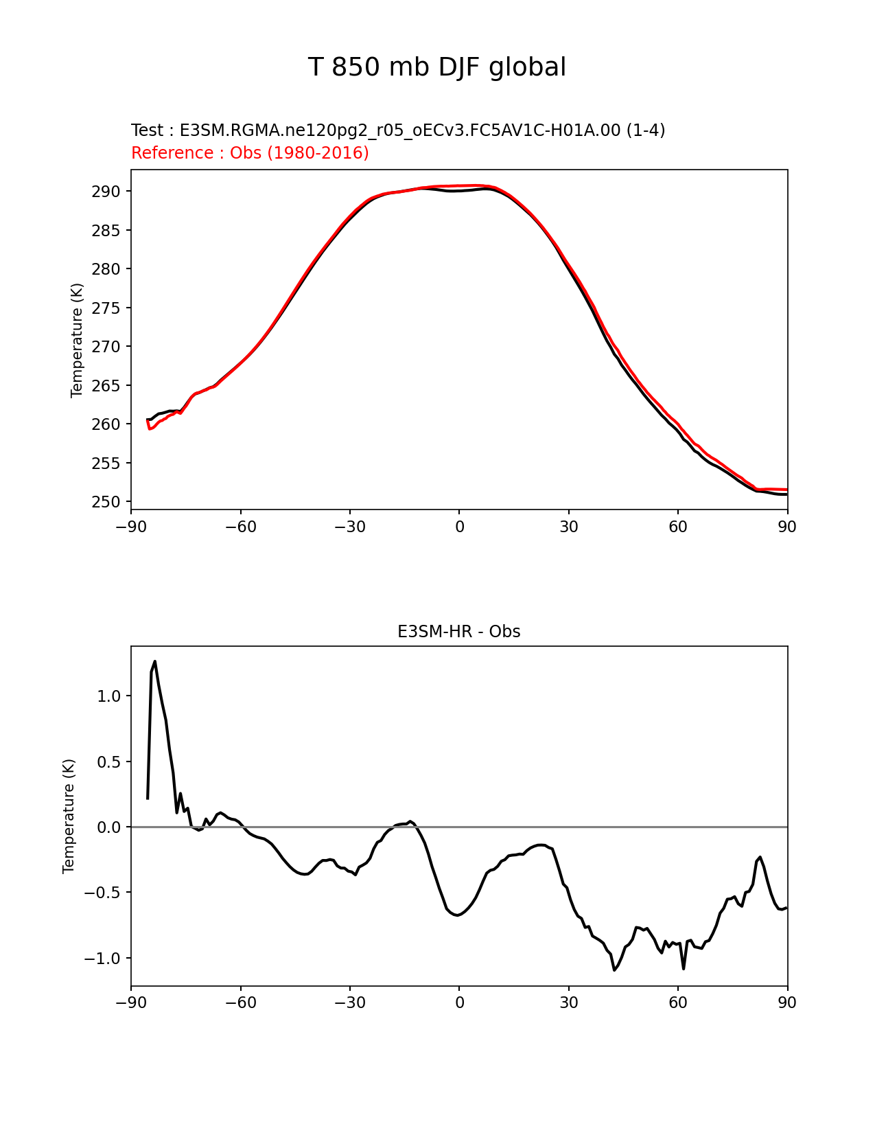 Use this command to recreate this image: | e3sm_diags zonal_mean_xy --no_viewer --case_id 'MERRA2' --sets 'zonal_mean_xy' --run_type 'model_vs_obs' --variables 'T' --seasons 'DJF' --regions 'global' --regrid_tool 'esmf' --regrid_method 'conservative' --plevs '850.0' --main_title 'T 850 mb DJF global' --backend 'mpl' --output_format 'png' --canvas_size_w '1212' --canvas_size_h '1628' --figsize '8.5' '11.0' --dpi '150' --arrows --test_name 'E3SM.RGMA.ne120pg2_r05_oECv3.FC5AV1C-H01A.00' --test_colormap 'cet_rainbow.rgb' --ref_name 'MERRA2' --reference_name 'Obs' --reference_colormap 'cet_rainbow.rgb' --diff_title 'E3SM-HR - Obs' --diff_colormap 'diverging_bwr.rgb' --multiprocessing --num_workers '30' --granulate 'variables' 'seasons' 'plevs' 'regions' --selectors 'sets' 'seasons' --results_dir '/global/cscratch1/sd/whannah/diags_tmp/RGMA/E3SM-HR_vs_Obs' --reference_data_path '/global/cfs/cdirs/e3sm/acme_diags/obs_for_e3sm_diags/climatology/' --test_data_path '/global/cscratch1/sd/whannah/e3sm_scratch/cori-knl/E3SM.RGMA.ne120pg2_r05_oECv3.FC5AV1C-H01A.00/clim/' |