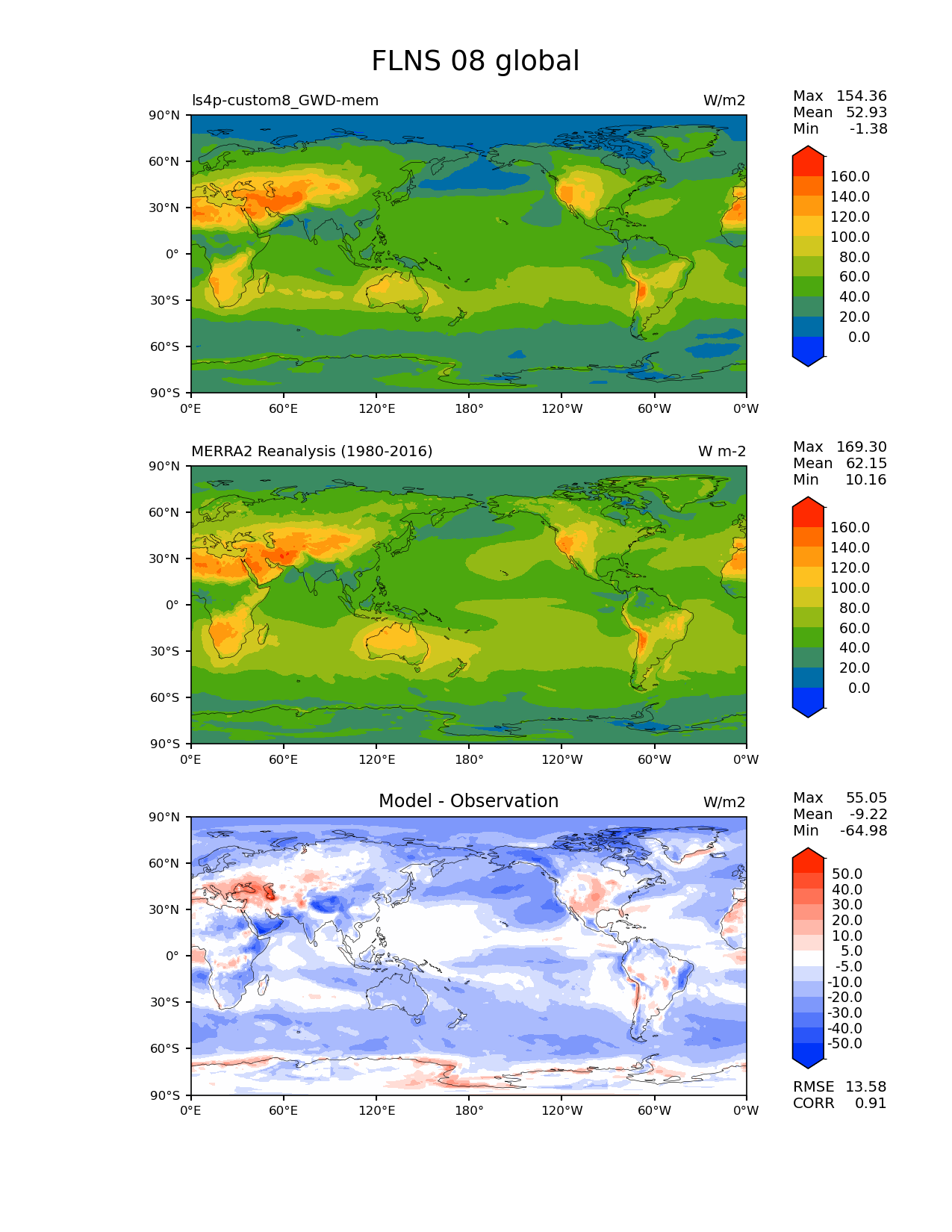 Use this command to recreate this image: | e3sm_diags lat_lon --no_viewer --reference_data_path '/global/cfs/cdirs/e3sm/diagnostics/observations/Atm/climatology' --test_data_path '/pscratch/sd/x/xie7/ls4p/zppy/output/ls4p-custom8_GWD-mem/ls4p-custom8_GWD-mem_ens' --results_dir '/global/cfs/cdirs/e3sm/www/xie7/diags_ls4p/ls4p_GWD_ens' --case_id 'MERRA2' --run_type 'model_vs_obs' --sets 'lat_lon' --variables 'FLNS' --seasons 08 --regions 'global' --regrid_tool 'esmf' --regrid_method 'conservative' --num_workers '4' --main_title 'FLNS 08 global' --backend 'mpl' --output_format 'png' --canvas_size_w '1212' --canvas_size_h '1628' --figsize '8.5' '11.0' --dpi '150' --arrows --contour_levels '0' '20' '40' '60' '80' '100' '120' '140' '160' --test_name 'ls4p-custom8_GWD-mem' --test_colormap 'cet_rainbow.rgb' --ref_name 'MERRA2' --reference_name 'MERRA2 Reanalysis' --reference_colormap 'cet_rainbow.rgb' --diff_title 'Model - Observation' --diff_colormap 'diverging_bwr.rgb' --diff_levels '-50' '-40' '-30' '-20' '-10' '-5' '5' '10' '20' '30' '40' '50' --granulate 'variables' 'seasons' 'plevs' 'regions' --selectors 'sets' 'seasons' |