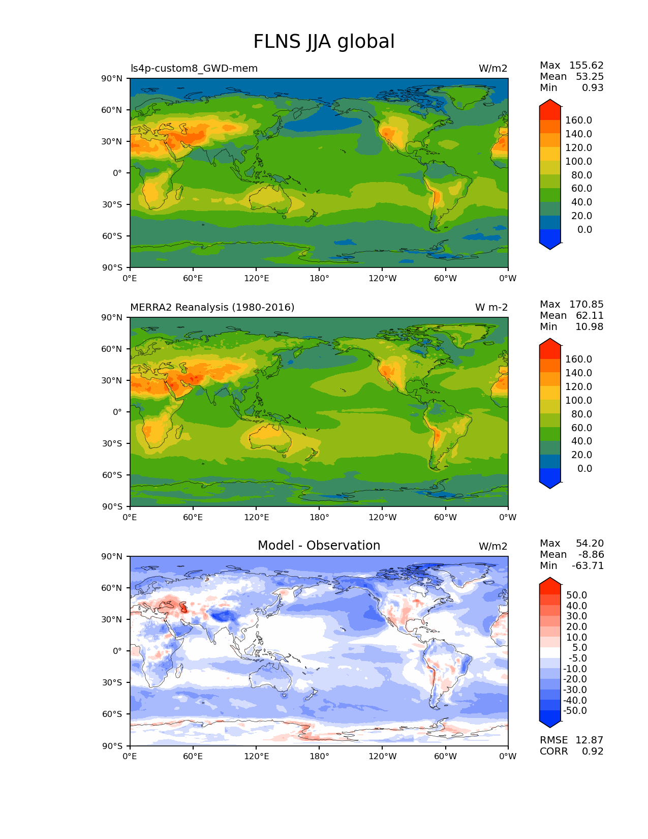 Use this command to recreate this image: | e3sm_diags lat_lon --no_viewer --reference_data_path '/global/cfs/cdirs/e3sm/diagnostics/observations/Atm/climatology' --test_data_path '/pscratch/sd/x/xie7/ls4p/zppy/output/ls4p-custom8_GWD-mem/ls4p-custom8_GWD-mem_ens' --results_dir '/global/cfs/cdirs/e3sm/www/xie7/diags_ls4p/ls4p_GWD_ens' --case_id 'MERRA2' --run_type 'model_vs_obs' --sets 'lat_lon' --variables 'FLNS' --seasons 'JJA' --regions 'global' --regrid_tool 'esmf' --regrid_method 'conservative' --num_workers '4' --main_title 'FLNS JJA global' --backend 'mpl' --output_format 'png' --canvas_size_w '1212' --canvas_size_h '1628' --figsize '8.5' '11.0' --dpi '150' --arrows --contour_levels '0' '20' '40' '60' '80' '100' '120' '140' '160' --test_name 'ls4p-custom8_GWD-mem' --test_colormap 'cet_rainbow.rgb' --ref_name 'MERRA2' --reference_name 'MERRA2 Reanalysis' --reference_colormap 'cet_rainbow.rgb' --diff_title 'Model - Observation' --diff_colormap 'diverging_bwr.rgb' --diff_levels '-50' '-40' '-30' '-20' '-10' '-5' '5' '10' '20' '30' '40' '50' --granulate 'variables' 'seasons' 'plevs' 'regions' --selectors 'sets' 'seasons' |