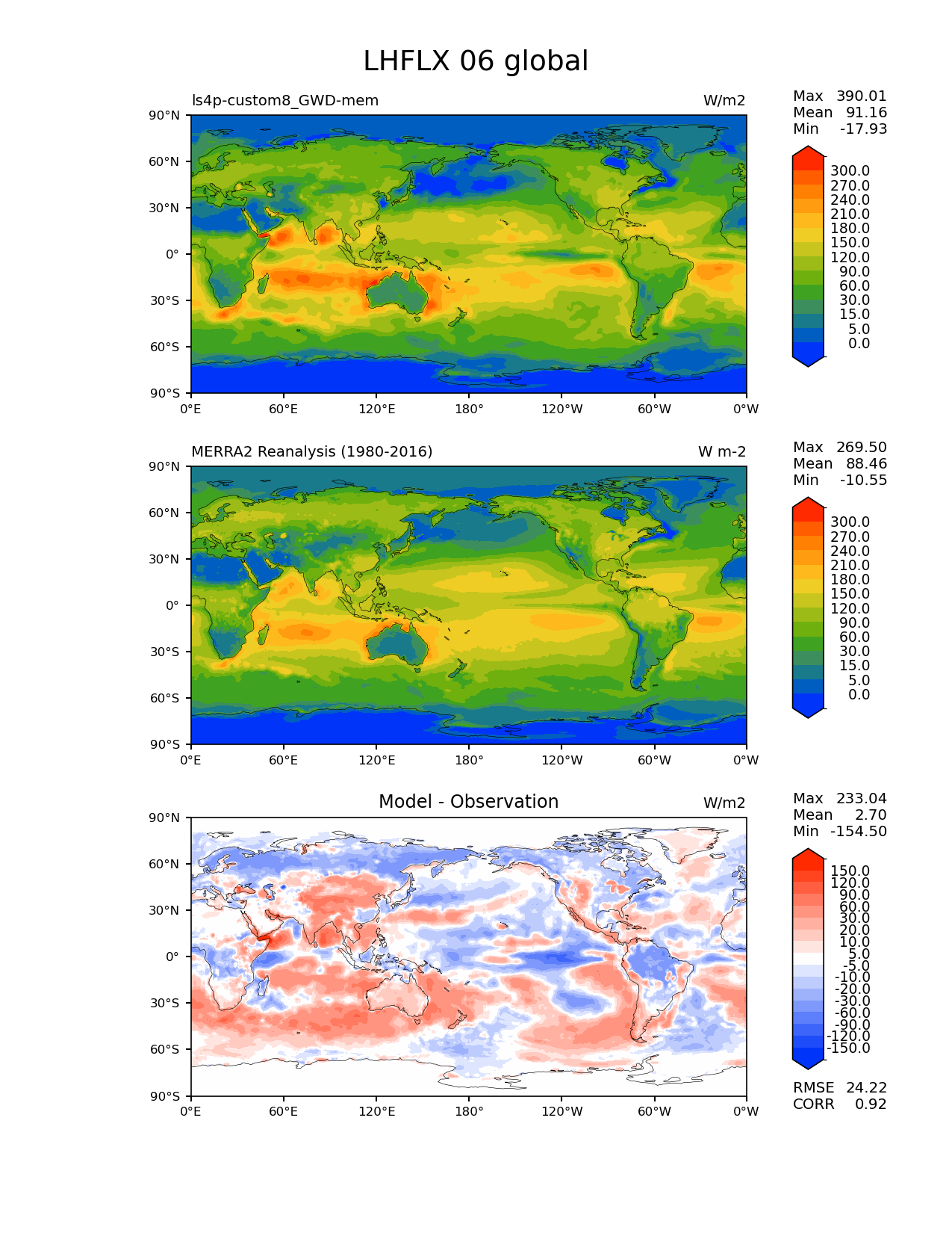 Use this command to recreate this image: | e3sm_diags lat_lon --no_viewer --reference_data_path '/global/cfs/cdirs/e3sm/diagnostics/observations/Atm/climatology' --test_data_path '/pscratch/sd/x/xie7/ls4p/zppy/output/ls4p-custom8_GWD-mem/ls4p-custom8_GWD-mem_ens' --results_dir '/global/cfs/cdirs/e3sm/www/xie7/diags_ls4p/ls4p_GWD_ens' --case_id 'MERRA2' --run_type 'model_vs_obs' --sets 'lat_lon' --variables 'LHFLX' --seasons 06 --regions 'global' --regrid_tool 'esmf' --regrid_method 'conservative' --num_workers '4' --main_title 'LHFLX 06 global' --backend 'mpl' --output_format 'png' --canvas_size_w '1212' --canvas_size_h '1628' --figsize '8.5' '11.0' --dpi '150' --arrows --contour_levels '0' '5' '15' '30' '60' '90' '120' '150' '180' '210' '240' '270' '300' --test_name 'ls4p-custom8_GWD-mem' --test_colormap 'cet_rainbow.rgb' --ref_name 'MERRA2' --reference_name 'MERRA2 Reanalysis' --reference_colormap 'cet_rainbow.rgb' --diff_title 'Model - Observation' --diff_colormap 'diverging_bwr.rgb' --diff_levels '-150' '-120' '-90' '-60' '-30' '-20' '-10' '-5' '5' '10' '20' '30' '60' '90' '120' '150' --granulate 'variables' 'seasons' 'plevs' 'regions' --selectors 'sets' 'seasons' |