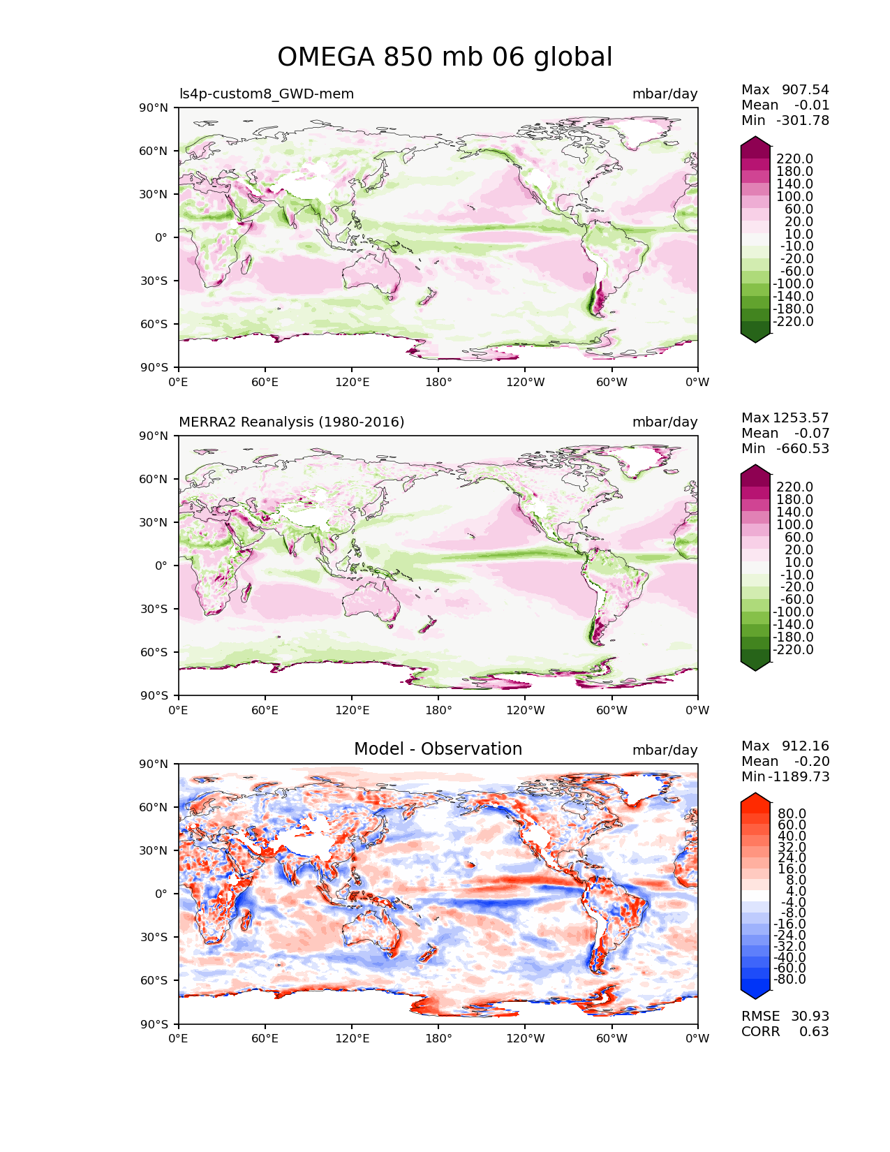 Use this command to recreate this image: | e3sm_diags lat_lon --no_viewer --reference_data_path '/global/cfs/cdirs/e3sm/diagnostics/observations/Atm/climatology' --test_data_path '/pscratch/sd/x/xie7/ls4p/zppy/output/ls4p-custom8_GWD-mem/ls4p-custom8_GWD-mem_ens' --results_dir '/global/cfs/cdirs/e3sm/www/xie7/diags_ls4p/ls4p_GWD_ens' --case_id 'MERRA2' --run_type 'model_vs_obs' --sets 'lat_lon' --variables 'OMEGA' --seasons 06 --regions 'global' --regrid_tool 'esmf' --regrid_method 'bilinear' --plevs '850.0' --num_workers '4' --main_title 'OMEGA 850 mb 06 global' --backend 'mpl' --output_format 'png' --canvas_size_w '1212' --canvas_size_h '1628' --figsize '8.5' '11.0' --dpi '150' --arrows --contour_levels '-220' '-180' '-140' '-100' '-60' '-20' '-10' '10' '20' '60' '100' '140' '180' '220' --test_name 'ls4p-custom8_GWD-mem' --test_colormap 'PiYG_r' --ref_name 'MERRA2' --reference_name 'MERRA2 Reanalysis' --reference_colormap 'PiYG_r' --diff_title 'Model - Observation' --diff_colormap 'diverging_bwr.rgb' --diff_levels '-80' '-60' '-40' '-32' '-24' '-16' '-8' '-4' '4' '8' '16' '24' '32' '40' '60' '80' --granulate 'variables' 'seasons' 'plevs' 'regions' --selectors 'sets' 'seasons' |
