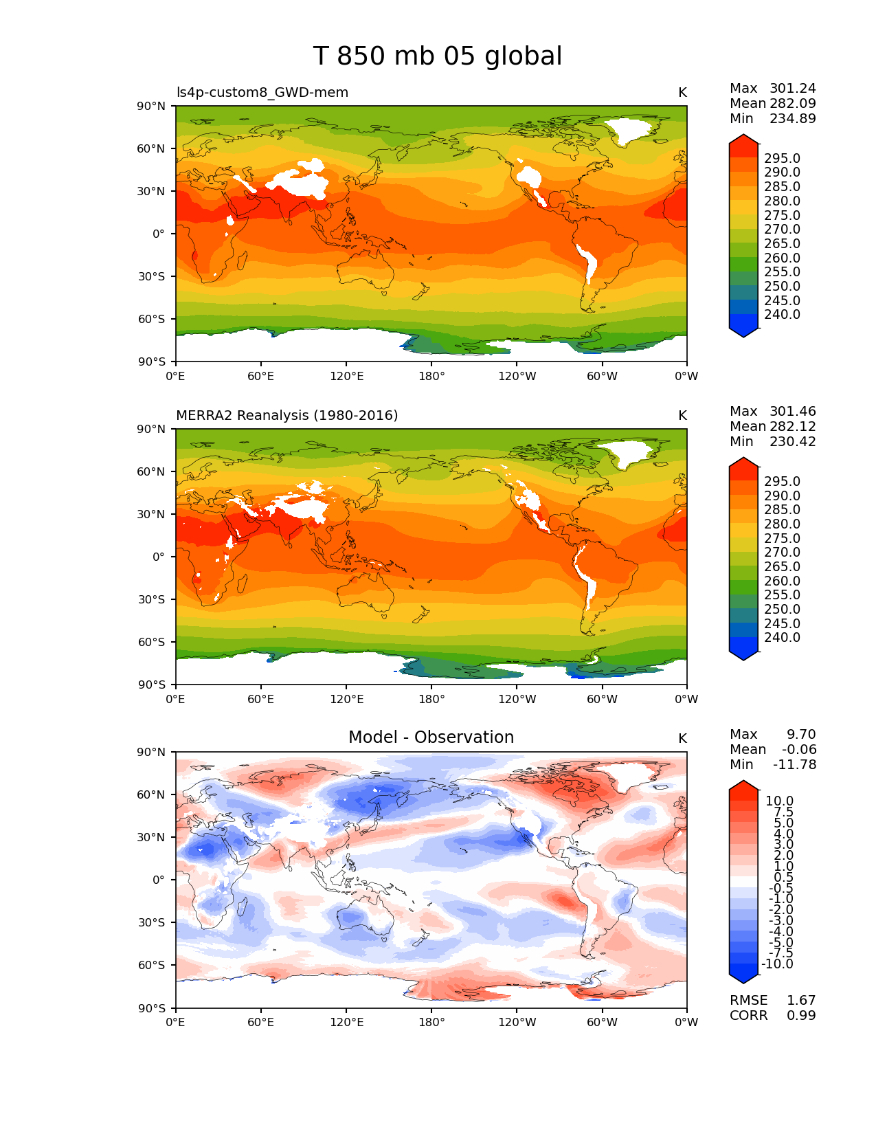 Use this command to recreate this image: | e3sm_diags lat_lon --no_viewer --reference_data_path '/global/cfs/cdirs/e3sm/diagnostics/observations/Atm/climatology' --test_data_path '/pscratch/sd/x/xie7/ls4p/zppy/output/ls4p-custom8_GWD-mem/ls4p-custom8_GWD-mem_ens' --results_dir '/global/cfs/cdirs/e3sm/www/xie7/diags_ls4p/ls4p_GWD_ens' --case_id 'MERRA2' --run_type 'model_vs_obs' --sets 'lat_lon' --variables 'T' --seasons 05 --regions 'global' --regrid_tool 'esmf' --regrid_method 'bilinear' --plevs '850.0' --num_workers '4' --main_title 'T 850 mb 05 global' --backend 'mpl' --output_format 'png' --canvas_size_w '1212' --canvas_size_h '1628' --figsize '8.5' '11.0' --dpi '150' --arrows --contour_levels '240' '245' '250' '255' '260' '265' '270' '275' '280' '285' '290' '295' --test_name 'ls4p-custom8_GWD-mem' --test_colormap 'cet_rainbow.rgb' --ref_name 'MERRA2' --reference_name 'MERRA2 Reanalysis' --reference_colormap 'cet_rainbow.rgb' --diff_title 'Model - Observation' --diff_colormap 'diverging_bwr.rgb' --diff_levels '-10' '-7.5' '-5' '-4' '-3' '-2' '-1' '-0.5' '0.5' '1' '2' '3' '4' '5' '7.5' '10' --granulate 'variables' 'seasons' 'plevs' 'regions' --selectors 'sets' 'seasons' |