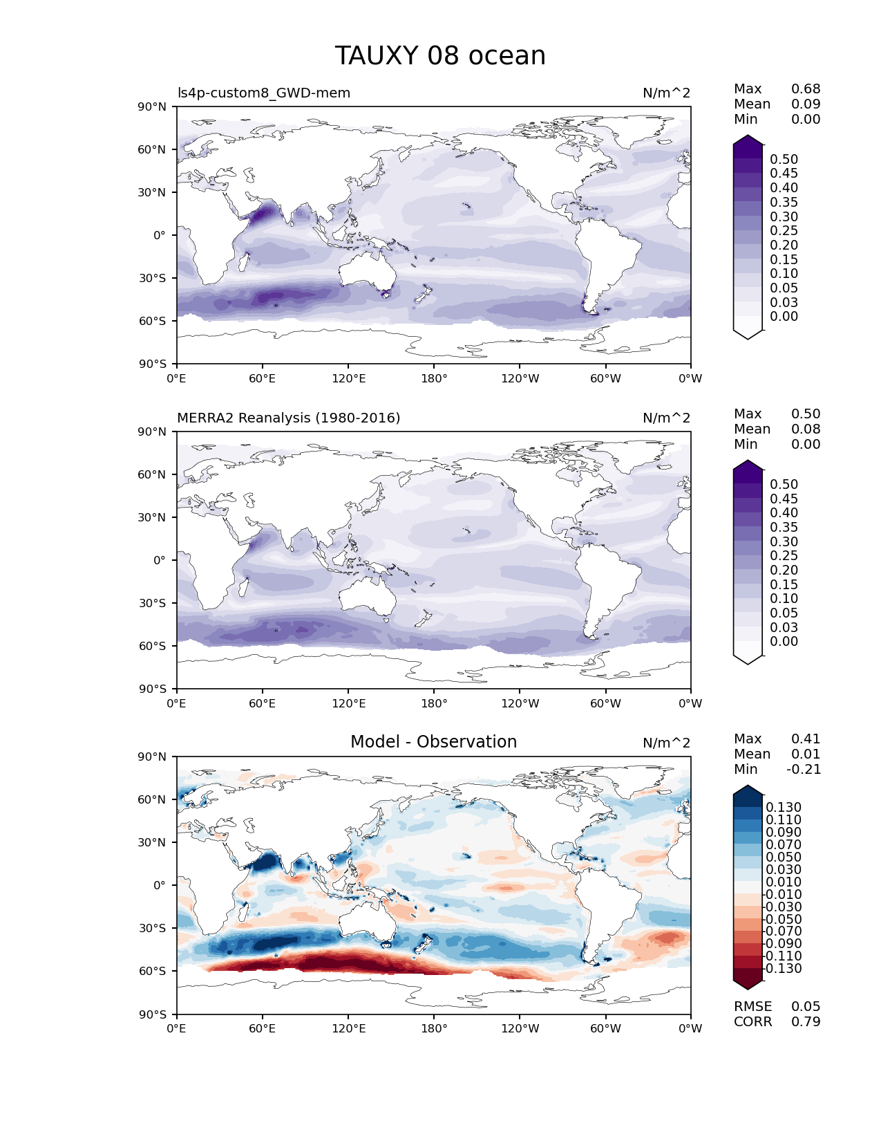Use this command to recreate this image: | e3sm_diags lat_lon --no_viewer --reference_data_path '/global/cfs/cdirs/e3sm/diagnostics/observations/Atm/climatology' --test_data_path '/pscratch/sd/x/xie7/ls4p/zppy/output/ls4p-custom8_GWD-mem/ls4p-custom8_GWD-mem_ens' --results_dir '/global/cfs/cdirs/e3sm/www/xie7/diags_ls4p/ls4p_GWD_ens' --case_id 'MERRA2' --run_type 'model_vs_obs' --sets 'lat_lon' --variables 'TAUXY' --seasons 08 --regions 'ocean' --regrid_tool 'esmf' --regrid_method 'bilinear' --num_workers '4' --main_title 'TAUXY 08 ocean' --backend 'mpl' --output_format 'png' --canvas_size_w '1212' --canvas_size_h '1628' --figsize '8.5' '11.0' --dpi '150' --arrows --contour_levels '0.0' '0.025' '0.05' '0.1' '0.15' '0.2' '0.25' '0.3' '0.35' '0.4' '0.45' '0.5' --test_name 'ls4p-custom8_GWD-mem' --test_colormap 'Purples' --ref_name 'MERRA2' --reference_name 'MERRA2 Reanalysis' --reference_colormap 'Purples' --diff_title 'Model - Observation' --diff_colormap 'RdBu' --diff_levels '-0.13' '-0.11' '-0.09' '-0.07' '-0.05' '-0.03' '-0.01' '0.01' '0.03' '0.05' '0.07' '0.09' '0.11' '0.13' --granulate 'variables' 'seasons' 'plevs' 'regions' --selectors 'sets' 'seasons' |
