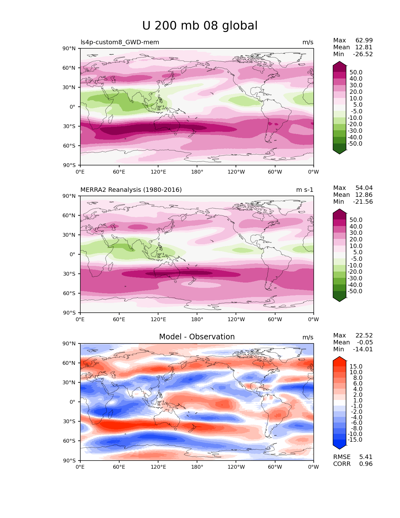 Use this command to recreate this image: | e3sm_diags lat_lon --no_viewer --reference_data_path '/global/cfs/cdirs/e3sm/diagnostics/observations/Atm/climatology' --test_data_path '/pscratch/sd/x/xie7/ls4p/zppy/output/ls4p-custom8_GWD-mem/ls4p-custom8_GWD-mem_ens' --results_dir '/global/cfs/cdirs/e3sm/www/xie7/diags_ls4p/ls4p_GWD_ens' --case_id 'MERRA2' --run_type 'model_vs_obs' --sets 'lat_lon' --variables 'U' --seasons 08 --regions 'global' --regrid_tool 'esmf' --regrid_method 'conservative' --plevs '200.0' --num_workers '4' --main_title 'U 200 mb 08 global' --backend 'mpl' --output_format 'png' --canvas_size_w '1212' --canvas_size_h '1628' --figsize '8.5' '11.0' --dpi '150' --arrows --contour_levels '-50' '-40' '-30' '-20' '-10' '-5' '5' '10' '20' '30' '40' '50' --test_name 'ls4p-custom8_GWD-mem' --test_colormap 'PiYG_r' --ref_name 'MERRA2' --reference_name 'MERRA2 Reanalysis' --reference_colormap 'PiYG_r' --diff_title 'Model - Observation' --diff_colormap 'diverging_bwr.rgb' --diff_levels '-15' '-10' '-8' '-6' '-4' '-2' '-1' '1' '2' '4' '6' '8' '10' '15' --granulate 'variables' 'seasons' 'plevs' 'regions' --selectors 'sets' 'seasons' |