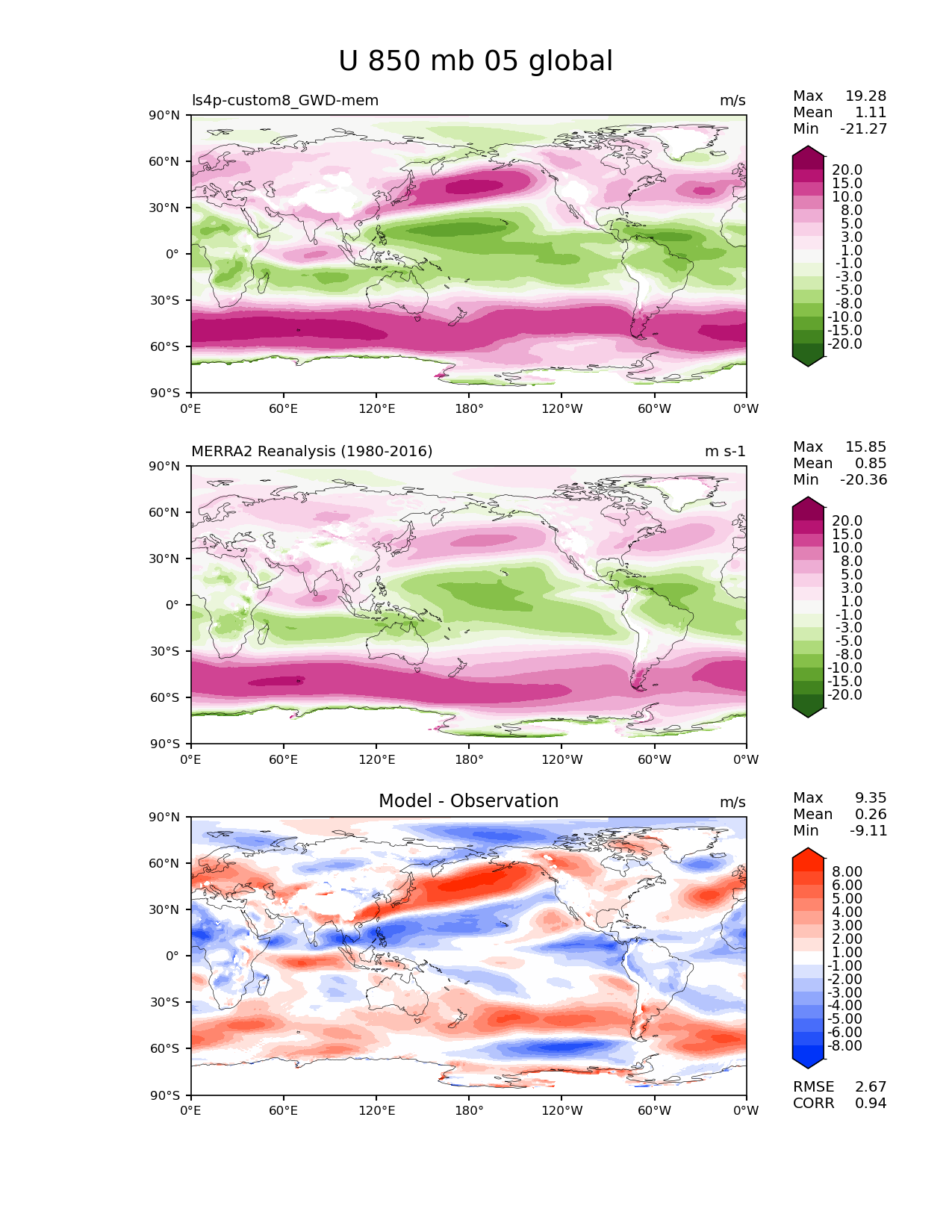 Use this command to recreate this image: | e3sm_diags lat_lon --no_viewer --reference_data_path '/global/cfs/cdirs/e3sm/diagnostics/observations/Atm/climatology' --test_data_path '/pscratch/sd/x/xie7/ls4p/zppy/output/ls4p-custom8_GWD-mem/ls4p-custom8_GWD-mem_ens' --results_dir '/global/cfs/cdirs/e3sm/www/xie7/diags_ls4p/ls4p_GWD_ens' --case_id 'MERRA2' --run_type 'model_vs_obs' --sets 'lat_lon' --variables 'U' --seasons 05 --regions 'global' --regrid_tool 'esmf' --regrid_method 'bilinear' --plevs '850.0' --num_workers '4' --main_title 'U 850 mb 05 global' --backend 'mpl' --output_format 'png' --canvas_size_w '1212' --canvas_size_h '1628' --figsize '8.5' '11.0' --dpi '150' --arrows --contour_levels '-20' '-15' '-10' '-8' '-5' '-3' '-1' '1' '3' '5' '8' '10' '15' '20' --test_name 'ls4p-custom8_GWD-mem' --test_colormap 'PiYG_r' --ref_name 'MERRA2' --reference_name 'MERRA2 Reanalysis' --reference_colormap 'PiYG_r' --diff_title 'Model - Observation' --diff_colormap 'diverging_bwr.rgb' --diff_levels '-8' '-6' '-5' '-4' '-3' '-2' '-1' '1' '2' '3' '4' '5' '6' '8' --granulate 'variables' 'seasons' 'plevs' 'regions' --selectors 'sets' 'seasons' |