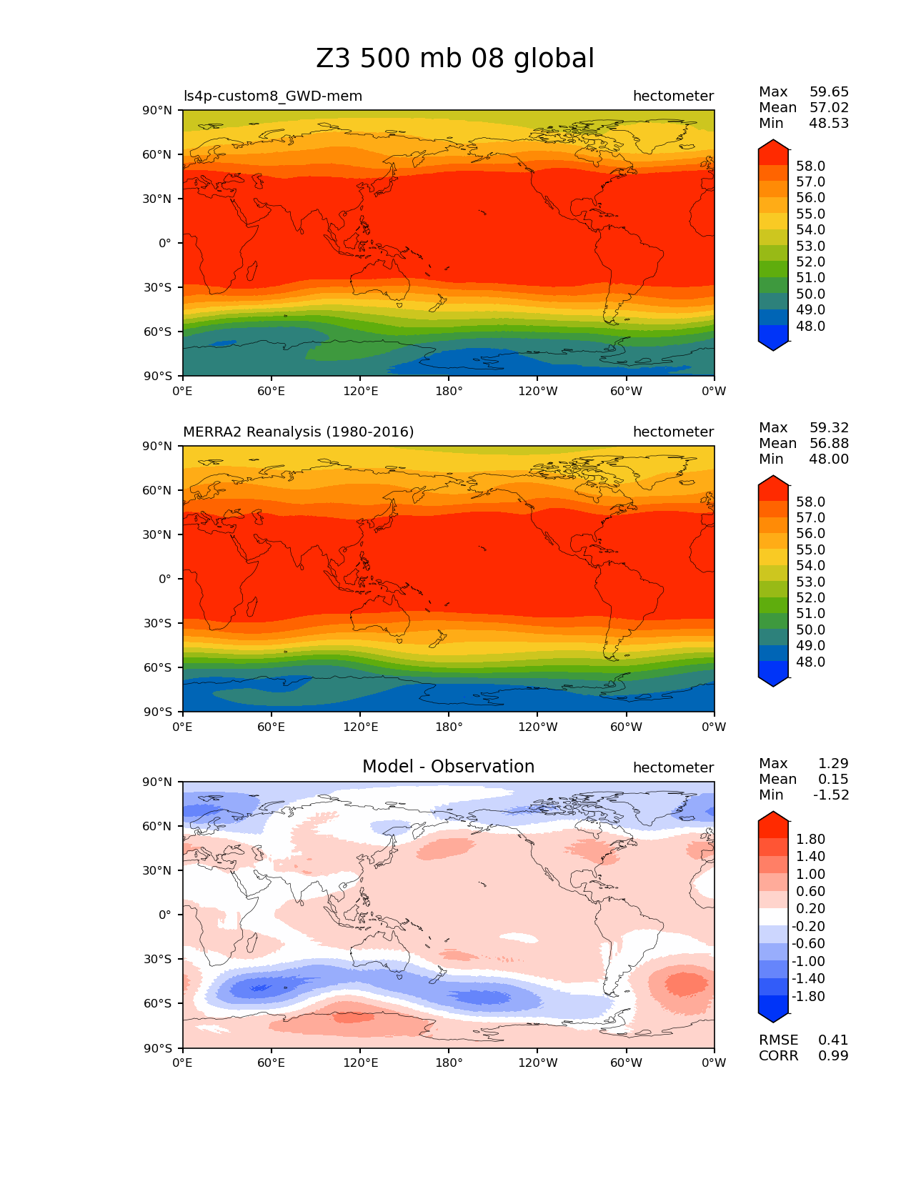 Use this command to recreate this image: | e3sm_diags lat_lon --no_viewer --reference_data_path '/global/cfs/cdirs/e3sm/diagnostics/observations/Atm/climatology' --test_data_path '/pscratch/sd/x/xie7/ls4p/zppy/output/ls4p-custom8_GWD-mem/ls4p-custom8_GWD-mem_ens' --results_dir '/global/cfs/cdirs/e3sm/www/xie7/diags_ls4p/ls4p_GWD_ens' --case_id 'MERRA2' --run_type 'model_vs_obs' --sets 'lat_lon' --variables 'Z3' --seasons 08 --regions 'global' --regrid_tool 'esmf' --regrid_method 'conservative' --plevs '500.0' --num_workers '4' --main_title 'Z3 500 mb 08 global' --backend 'mpl' --output_format 'png' --canvas_size_w '1212' --canvas_size_h '1628' --figsize '8.5' '11.0' --dpi '150' --arrows --contour_levels '48' '49' '50' '51' '52' '53' '54' '55' '56' '57' '58' --test_name 'ls4p-custom8_GWD-mem' --test_colormap 'cet_rainbow.rgb' --ref_name 'MERRA2' --reference_name 'MERRA2 Reanalysis' --reference_colormap 'cet_rainbow.rgb' --diff_title 'Model - Observation' --diff_colormap 'diverging_bwr.rgb' --diff_levels '-1.8' '-1.4' '-1.0' '-0.6' '-0.2' '0.2' '0.6' '1.0' '1.4' '1.8' --granulate 'variables' 'seasons' 'plevs' 'regions' --selectors 'sets' 'seasons' |