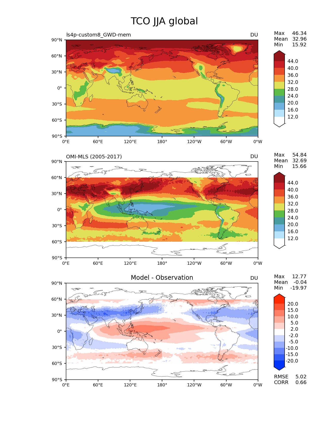 Use this command to recreate this image: | e3sm_diags lat_lon --no_viewer --reference_data_path '/global/cfs/cdirs/e3sm/diagnostics/observations/Atm/climatology' --test_data_path '/pscratch/sd/x/xie7/ls4p/zppy/output/ls4p-custom8_GWD-mem/ls4p-custom8_GWD-mem_ens' --results_dir '/global/cfs/cdirs/e3sm/www/xie7/diags_ls4p/ls4p_GWD_ens' --case_id 'OMI-MLS' --run_type 'model_vs_obs' --sets 'lat_lon' --variables 'TCO' --seasons 'JJA' --regions 'global' --regrid_tool 'esmf' --regrid_method 'conservative' --num_workers '4' --main_title 'TCO JJA global' --backend 'mpl' --output_format 'png' --canvas_size_w '1212' --canvas_size_h '1628' --figsize '8.5' '11.0' --dpi '150' --arrows --contour_levels '12' '16' '20' '24' '28' '32' '36' '40' '44' --test_name 'ls4p-custom8_GWD-mem' --test_colormap 'WhiteBlueGreenYellowRed.rgb' --ref_name 'OMI-MLS' --reference_name 'OMI-MLS' --reference_colormap 'WhiteBlueGreenYellowRed.rgb' --diff_title 'Model - Observation' --diff_colormap 'diverging_bwr.rgb' --diff_levels '-20' '-15' '-10' '-5' '-2' '2' '5' '10' '15' '20' --granulate 'variables' 'seasons' 'plevs' 'regions' --selectors 'sets' 'seasons' |