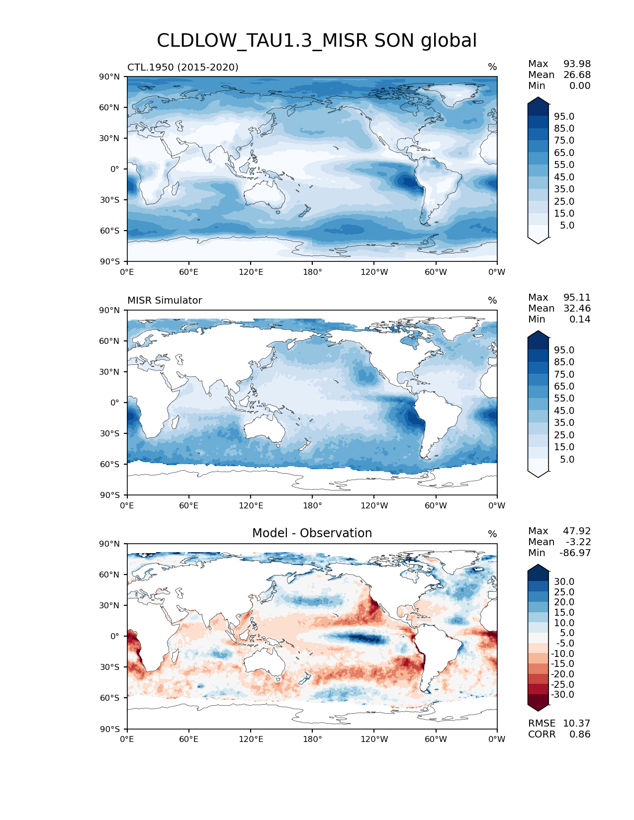 Use this command to recreate this image: | e3sm_diags lat_lon --no_viewer --case_id 'Cloud MISR' --sets 'lat_lon' --run_type 'model_vs_obs' --variables 'CLDLOW_TAU1.3_MISR' --seasons 'SON' --regions 'global' --regrid_tool 'esmf' --regrid_method 'conservative' --main_title 'CLDLOW_TAU1.3_MISR SON global' --backend 'mpl' --output_format 'png' --canvas_size_w '1212' --canvas_size_h '1628' --figsize '8.5' '11.0' --dpi '150' --arrows --contour_levels '5' '15' '25' '35' '45' '55' '65' '75' '85' '95' --test_name 'CTL.1950' --test_title ' ' --test_colormap 'Blues' --ref_name 'MISRCOSP' --reference_name 'MISR Simulator' --reference_colormap 'Blues' --diff_title 'Model - Observation' --diff_colormap 'RdBu' --diff_levels '-30' '-25' '-20' '-15' '-10' '-5' '5' '10' '15' '20' '25' '30' --num_workers '4' --granulate 'variables' 'seasons' 'plevs' 'regions' --selectors 'sets' 'seasons' --reference_data_path '/global/cfs/cdirs/e3sm/acme_diags/obs_for_e3sm_diags/climatology/' --test_data_path '/global/cscratch1/sd/xsongsio/E3SM_simulations/CTL.1950/diag/clim_rgr/6yr/' --results_dir '/global/cfs/cdirs/e3sm/www/xsongsio/CTL.1950/6yr' |