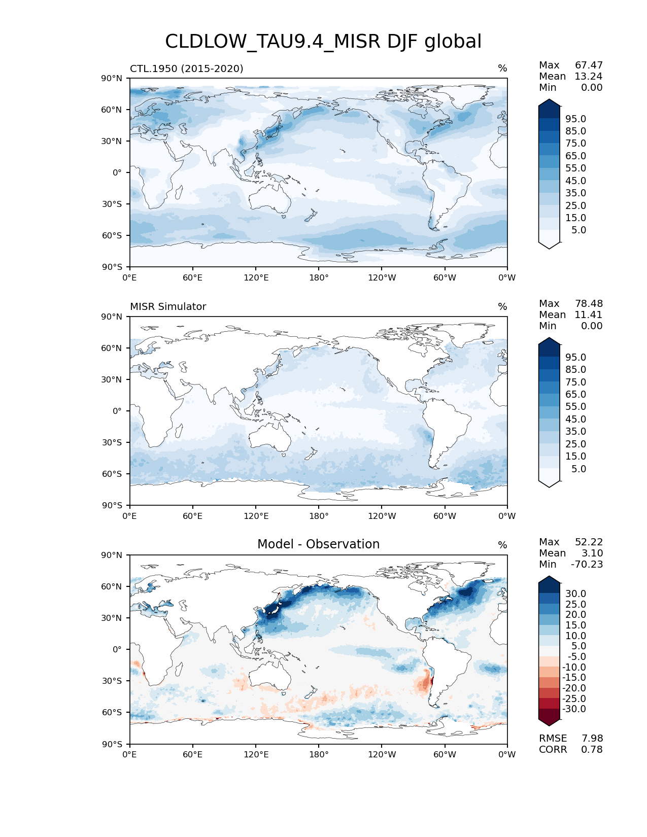 Use this command to recreate this image: | e3sm_diags lat_lon --no_viewer --case_id 'Cloud MISR' --sets 'lat_lon' --run_type 'model_vs_obs' --variables 'CLDLOW_TAU9.4_MISR' --seasons 'DJF' --regions 'global' --regrid_tool 'esmf' --regrid_method 'conservative' --main_title 'CLDLOW_TAU9.4_MISR DJF global' --backend 'mpl' --output_format 'png' --canvas_size_w '1212' --canvas_size_h '1628' --figsize '8.5' '11.0' --dpi '150' --arrows --contour_levels '5' '15' '25' '35' '45' '55' '65' '75' '85' '95' --test_name 'CTL.1950' --test_title ' ' --test_colormap 'Blues' --ref_name 'MISRCOSP' --reference_name 'MISR Simulator' --reference_colormap 'Blues' --diff_title 'Model - Observation' --diff_colormap 'RdBu' --diff_levels '-30' '-25' '-20' '-15' '-10' '-5' '5' '10' '15' '20' '25' '30' --num_workers '4' --granulate 'variables' 'seasons' 'plevs' 'regions' --selectors 'sets' 'seasons' --reference_data_path '/global/cfs/cdirs/e3sm/acme_diags/obs_for_e3sm_diags/climatology/' --test_data_path '/global/cscratch1/sd/xsongsio/E3SM_simulations/CTL.1950/diag/clim_rgr/6yr/' --results_dir '/global/cfs/cdirs/e3sm/www/xsongsio/CTL.1950/6yr' |