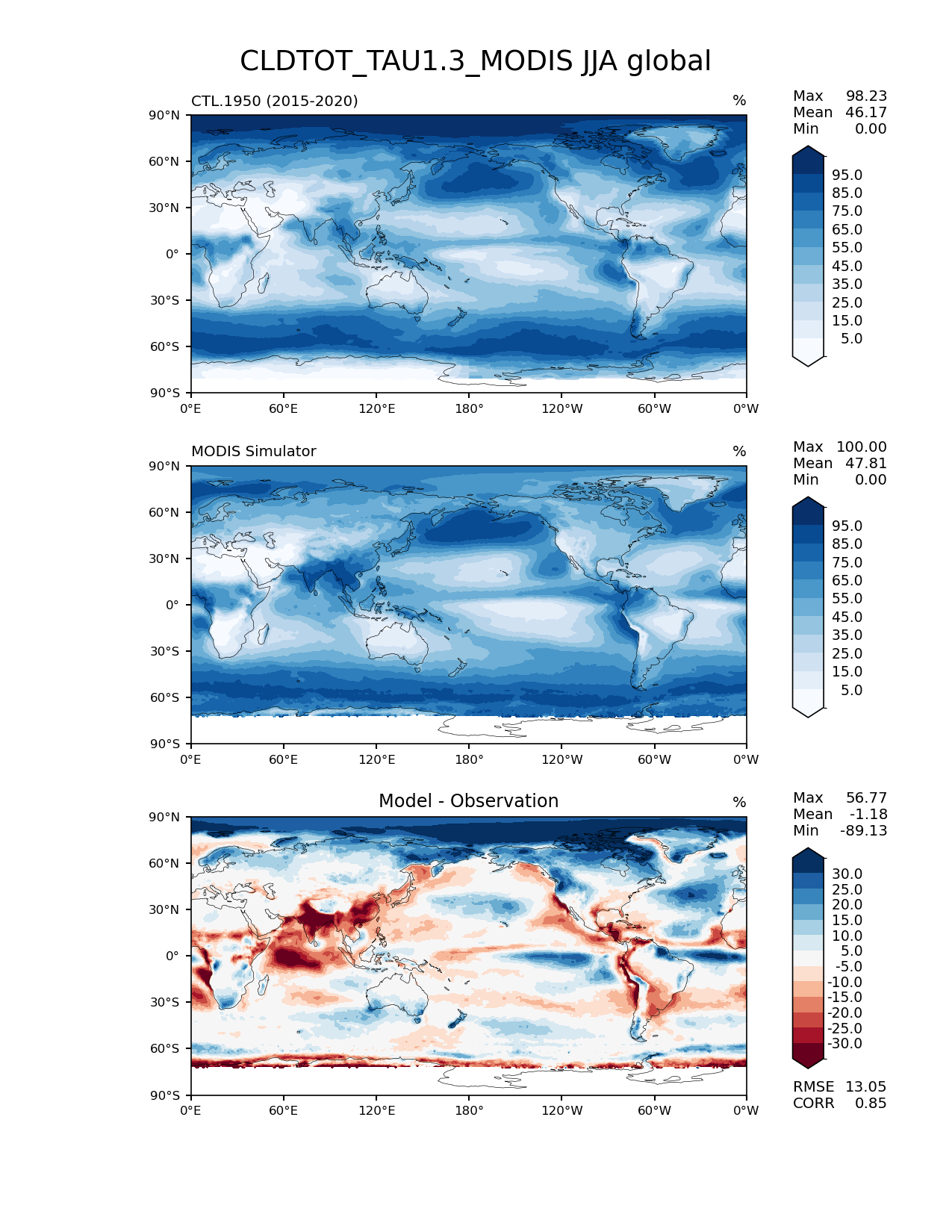 Use this command to recreate this image: | e3sm_diags lat_lon --no_viewer --case_id 'Cloud MODIS' --sets 'lat_lon' --run_type 'model_vs_obs' --variables 'CLDTOT_TAU1.3_MODIS' --seasons 'JJA' --regions 'global' --regrid_tool 'esmf' --regrid_method 'conservative' --main_title 'CLDTOT_TAU1.3_MODIS JJA global' --backend 'mpl' --output_format 'png' --canvas_size_w '1212' --canvas_size_h '1628' --figsize '8.5' '11.0' --dpi '150' --arrows --contour_levels '5' '15' '25' '35' '45' '55' '65' '75' '85' '95' --test_name 'CTL.1950' --test_title ' ' --test_colormap 'Blues' --ref_name 'MODISCOSP' --reference_name 'MODIS Simulator' --reference_colormap 'Blues' --diff_title 'Model - Observation' --diff_colormap 'RdBu' --diff_levels '-30' '-25' '-20' '-15' '-10' '-5' '5' '10' '15' '20' '25' '30' --num_workers '4' --granulate 'variables' 'seasons' 'plevs' 'regions' --selectors 'sets' 'seasons' --reference_data_path '/global/cfs/cdirs/e3sm/acme_diags/obs_for_e3sm_diags/climatology/' --test_data_path '/global/cscratch1/sd/xsongsio/E3SM_simulations/CTL.1950/diag/clim_rgr/6yr/' --results_dir '/global/cfs/cdirs/e3sm/www/xsongsio/CTL.1950/6yr' |