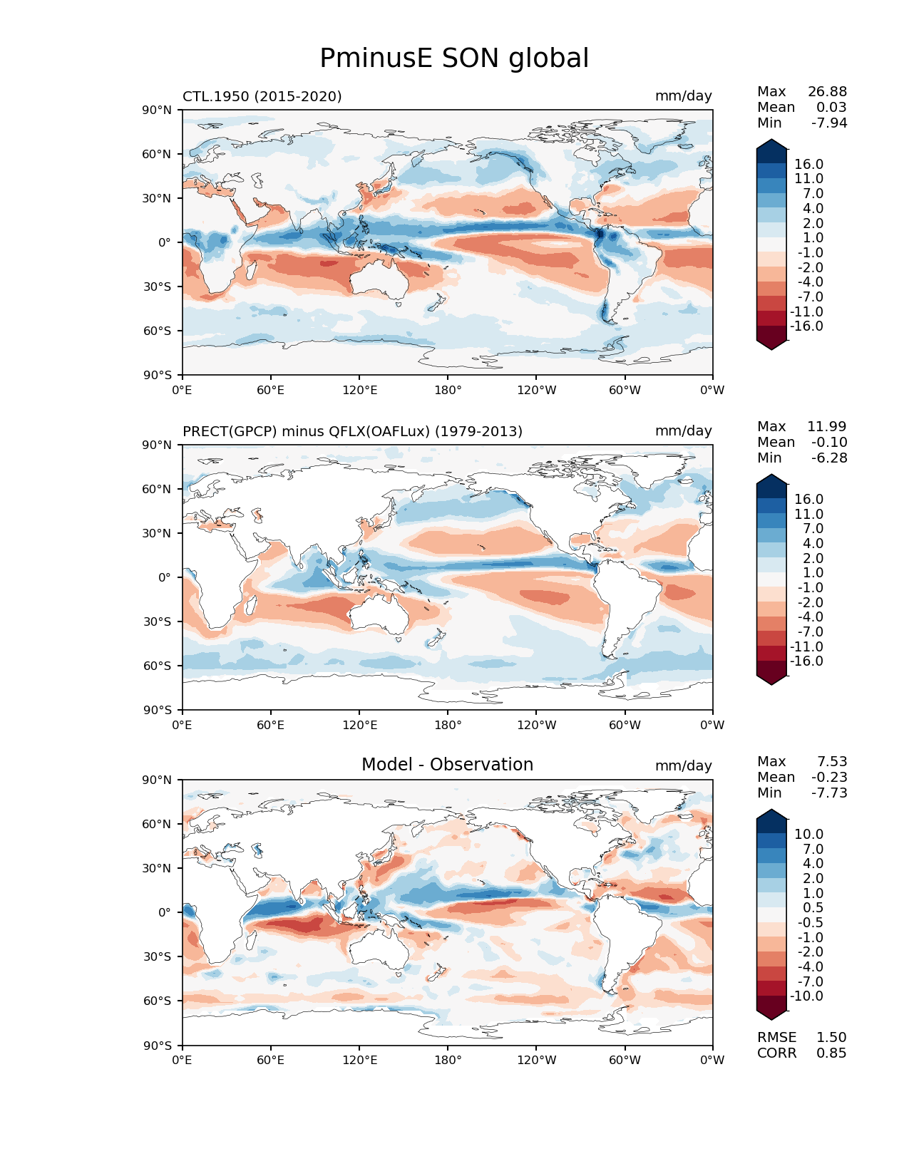 Use this command to recreate this image: | e3sm_diags lat_lon --no_viewer --case_id 'GPCP_OAFLux' --sets 'lat_lon' --run_type 'model_vs_obs' --variables 'PminusE' --seasons 'SON' --regions 'global' --regrid_tool 'esmf' --regrid_method 'conservative' --main_title 'PminusE SON global' --backend 'mpl' --output_format 'png' --canvas_size_w '1212' --canvas_size_h '1628' --figsize '8.5' '11.0' --dpi '150' --arrows --contour_levels '-16' '-11' '-7' '-4' '-2' '-1' '1' '2' '4' '7' '11' '16' --test_name 'CTL.1950' --test_title ' ' --test_colormap 'RdBu' --ref_name 'GPCP_OAFLux' --reference_name 'PRECT(GPCP) minus QFLX(OAFLux)' --reference_colormap 'RdBu' --diff_title 'Model - Observation' --diff_colormap 'RdBu' --diff_levels '-10' '-7' '-4' '-2' '-1' '-0.5' '0.5' '1' '2' '4' '7' '10' --num_workers '4' --granulate 'variables' 'seasons' 'plevs' 'regions' --selectors 'sets' 'seasons' --reference_data_path '/global/cfs/cdirs/e3sm/acme_diags/obs_for_e3sm_diags/climatology/' --test_data_path '/global/cscratch1/sd/xsongsio/E3SM_simulations/CTL.1950/diag/clim_rgr/6yr/' --results_dir '/global/cfs/cdirs/e3sm/www/xsongsio/CTL.1950/6yr' |