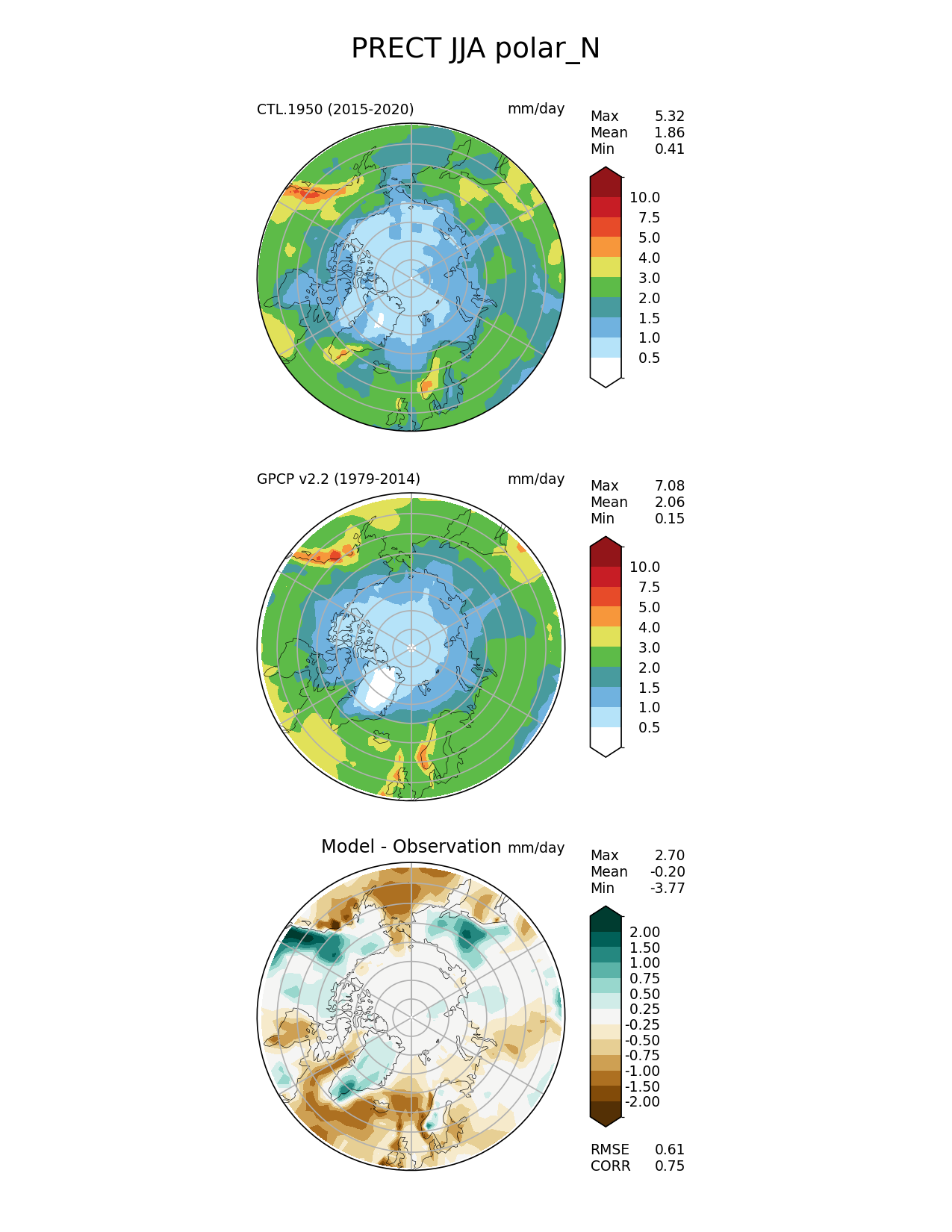 Use this command to recreate this image: | e3sm_diags polar --no_viewer --case_id 'GPCP_v2.2' --sets 'polar' --run_type 'model_vs_obs' --variables 'PRECT' --seasons 'JJA' --regions 'polar_N' --regrid_tool 'esmf' --regrid_method 'conservative' --main_title 'PRECT JJA polar_N' --backend 'mpl' --output_format 'png' --canvas_size_w '1212' --canvas_size_h '1628' --figsize '8.5' '11.0' --dpi '150' --arrows --contour_levels '0.5' '1' '1.5' '2' '3' '4' '5' '7.5' '10' --test_name 'CTL.1950' --test_title ' ' --test_colormap 'WhiteBlueGreenYellowRed.rgb' --ref_name 'GPCP_v2.2' --reference_name 'GPCP v2.2' --reference_colormap 'WhiteBlueGreenYellowRed.rgb' --diff_title 'Model - Observation' --diff_colormap 'BrBG' --diff_levels '-2' '-1.5' '-1' '-0.75' '-0.5' '-0.25' '0.25' '0.5' '0.75' '1' '1.5' '2' --num_workers '4' --granulate 'variables' 'seasons' 'plevs' 'regions' --selectors 'sets' 'seasons' --reference_data_path '/global/cfs/cdirs/e3sm/acme_diags/obs_for_e3sm_diags/climatology/' --test_data_path '/global/cscratch1/sd/xsongsio/E3SM_simulations/CTL.1950/diag/clim_rgr/6yr/' --results_dir '/global/cfs/cdirs/e3sm/www/xsongsio/CTL.1950/6yr' |