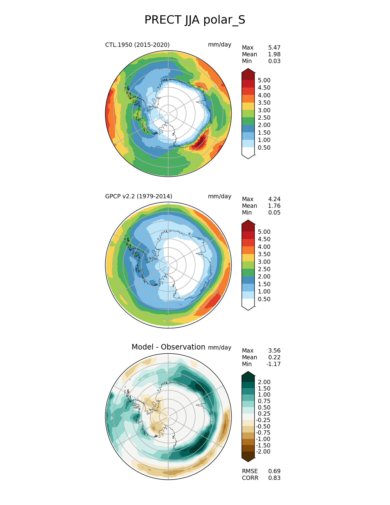 Use this command to recreate this image: | e3sm_diags polar --no_viewer --case_id 'GPCP_v2.2' --sets 'polar' --run_type 'model_vs_obs' --variables 'PRECT' --seasons 'JJA' --regions 'polar_S' --regrid_tool 'esmf' --regrid_method 'conservative' --main_title 'PRECT JJA polar_S' --backend 'mpl' --output_format 'png' --canvas_size_w '1212' --canvas_size_h '1628' --figsize '8.5' '11.0' --dpi '150' --arrows --contour_levels '0.5' '1' '1.5' '2' '2.5' '3' '3.5' '4' '4.5' '5' --test_name 'CTL.1950' --test_title ' ' --test_colormap 'WhiteBlueGreenYellowRed.rgb' --ref_name 'GPCP_v2.2' --reference_name 'GPCP v2.2' --reference_colormap 'WhiteBlueGreenYellowRed.rgb' --diff_title 'Model - Observation' --diff_colormap 'BrBG' --diff_levels '-2' '-1.5' '-1' '-0.75' '-0.5' '-0.25' '0.25' '0.5' '0.75' '1' '1.5' '2' --num_workers '4' --granulate 'variables' 'seasons' 'plevs' 'regions' --selectors 'sets' 'seasons' --reference_data_path '/global/cfs/cdirs/e3sm/acme_diags/obs_for_e3sm_diags/climatology/' --test_data_path '/global/cscratch1/sd/xsongsio/E3SM_simulations/CTL.1950/diag/clim_rgr/6yr/' --results_dir '/global/cfs/cdirs/e3sm/www/xsongsio/CTL.1950/6yr' |