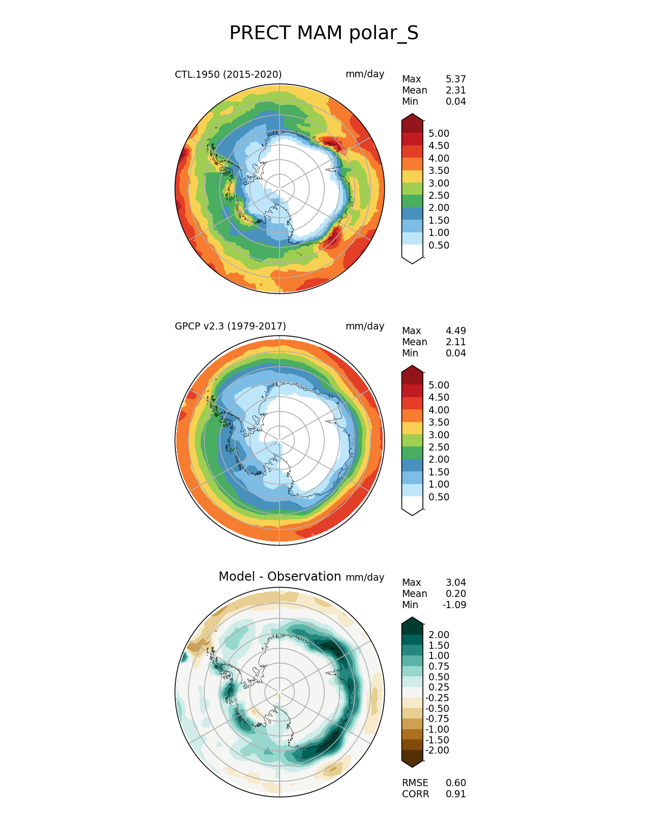 Use this command to recreate this image: | e3sm_diags polar --no_viewer --case_id 'GPCP_v2.3' --sets 'polar' --run_type 'model_vs_obs' --variables 'PRECT' --seasons 'MAM' --regions 'polar_S' --regrid_tool 'esmf' --regrid_method 'conservative' --main_title 'PRECT MAM polar_S' --backend 'mpl' --output_format 'png' --canvas_size_w '1212' --canvas_size_h '1628' --figsize '8.5' '11.0' --dpi '150' --arrows --contour_levels '0.5' '1' '1.5' '2' '2.5' '3' '3.5' '4' '4.5' '5' --test_name 'CTL.1950' --test_title ' ' --test_colormap 'WhiteBlueGreenYellowRed.rgb' --ref_name 'GPCP_v2.3' --reference_name 'GPCP v2.3' --reference_colormap 'WhiteBlueGreenYellowRed.rgb' --diff_title 'Model - Observation' --diff_colormap 'BrBG' --diff_levels '-2' '-1.5' '-1' '-0.75' '-0.5' '-0.25' '0.25' '0.5' '0.75' '1' '1.5' '2' --num_workers '4' --granulate 'variables' 'seasons' 'plevs' 'regions' --selectors 'sets' 'seasons' --reference_data_path '/global/cfs/cdirs/e3sm/acme_diags/obs_for_e3sm_diags/climatology/' --test_data_path '/global/cscratch1/sd/xsongsio/E3SM_simulations/CTL.1950/diag/clim_rgr/6yr/' --results_dir '/global/cfs/cdirs/e3sm/www/xsongsio/CTL.1950/6yr' |