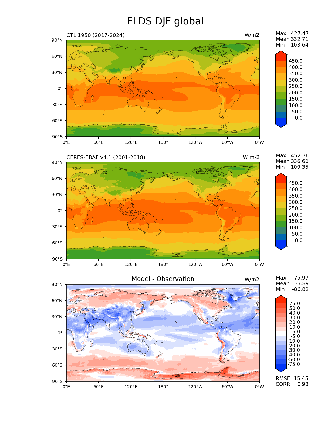 Use this command to recreate this image: | e3sm_diags lat_lon --no_viewer --reference_data_path '/global/cfs/cdirs/e3sm/acme_diags/obs_for_e3sm_diags/climatology/' --test_data_path '/pscratch/sd/x/xsongsio/DATA/CTL.1950/diag/clim_rgr/' --results_dir '/global/cfs/cdirs/e3sm/www/xsongsio/CTL.1950/8yr' --case_id 'CERES-EBAF-surface-v4.1' --run_type 'model_vs_obs' --sets 'lat_lon' --variables 'FLDS' --seasons 'DJF' --regions 'global' --regrid_tool 'esmf' --regrid_method 'conservative' --num_workers '4' --main_title 'FLDS DJF global' --backend 'mpl' --output_format 'png' --canvas_size_w '1212' --canvas_size_h '1628' --figsize '8.5' '11.0' --dpi '150' --arrows --contour_levels '0' '50' '100' '150' '200' '250' '300' '350' '400' '450' --test_name 'CTL.1950' --test_title ' ' --test_colormap 'cet_rainbow.rgb' --ref_name 'ceres_ebaf_surface_v4.1' --reference_name 'CERES-EBAF v4.1' --reference_colormap 'cet_rainbow.rgb' --diff_title 'Model - Observation' --diff_colormap 'diverging_bwr.rgb' --diff_levels '-75' '-50' '-40' '-30' '-20' '-10' '-5' '5' '10' '20' '30' '40' '50' '75' --granulate 'variables' 'seasons' 'plevs' 'regions' --selectors 'sets' 'seasons' |