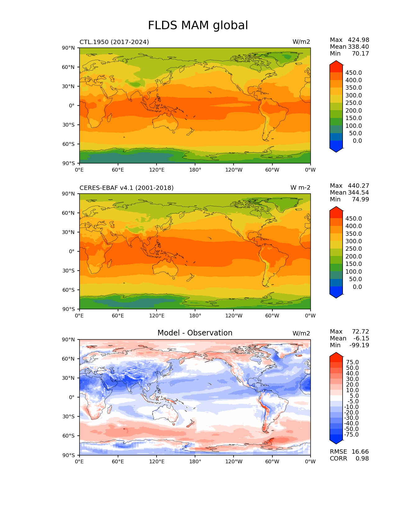 Use this command to recreate this image: | e3sm_diags lat_lon --no_viewer --reference_data_path '/global/cfs/cdirs/e3sm/acme_diags/obs_for_e3sm_diags/climatology/' --test_data_path '/pscratch/sd/x/xsongsio/DATA/CTL.1950/diag/clim_rgr/' --results_dir '/global/cfs/cdirs/e3sm/www/xsongsio/CTL.1950/8yr' --case_id 'CERES-EBAF-surface-v4.1' --run_type 'model_vs_obs' --sets 'lat_lon' --variables 'FLDS' --seasons 'MAM' --regions 'global' --regrid_tool 'esmf' --regrid_method 'conservative' --num_workers '4' --main_title 'FLDS MAM global' --backend 'mpl' --output_format 'png' --canvas_size_w '1212' --canvas_size_h '1628' --figsize '8.5' '11.0' --dpi '150' --arrows --contour_levels '0' '50' '100' '150' '200' '250' '300' '350' '400' '450' --test_name 'CTL.1950' --test_title ' ' --test_colormap 'cet_rainbow.rgb' --ref_name 'ceres_ebaf_surface_v4.1' --reference_name 'CERES-EBAF v4.1' --reference_colormap 'cet_rainbow.rgb' --diff_title 'Model - Observation' --diff_colormap 'diverging_bwr.rgb' --diff_levels '-75' '-50' '-40' '-30' '-20' '-10' '-5' '5' '10' '20' '30' '40' '50' '75' --granulate 'variables' 'seasons' 'plevs' 'regions' --selectors 'sets' 'seasons' |