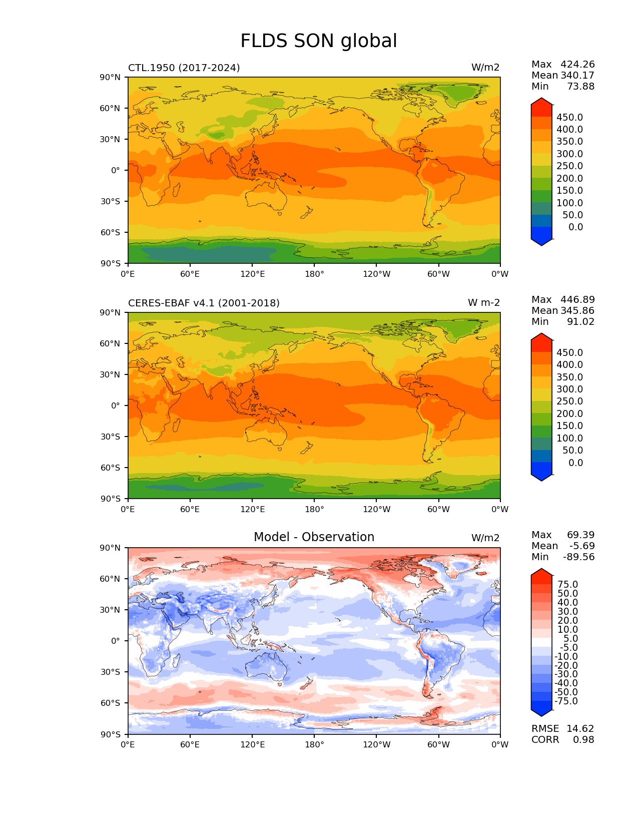 Use this command to recreate this image: | e3sm_diags lat_lon --no_viewer --reference_data_path '/global/cfs/cdirs/e3sm/acme_diags/obs_for_e3sm_diags/climatology/' --test_data_path '/pscratch/sd/x/xsongsio/DATA/CTL.1950/diag/clim_rgr/' --results_dir '/global/cfs/cdirs/e3sm/www/xsongsio/CTL.1950/8yr' --case_id 'CERES-EBAF-surface-v4.1' --run_type 'model_vs_obs' --sets 'lat_lon' --variables 'FLDS' --seasons 'SON' --regions 'global' --regrid_tool 'esmf' --regrid_method 'conservative' --num_workers '4' --main_title 'FLDS SON global' --backend 'mpl' --output_format 'png' --canvas_size_w '1212' --canvas_size_h '1628' --figsize '8.5' '11.0' --dpi '150' --arrows --contour_levels '0' '50' '100' '150' '200' '250' '300' '350' '400' '450' --test_name 'CTL.1950' --test_title ' ' --test_colormap 'cet_rainbow.rgb' --ref_name 'ceres_ebaf_surface_v4.1' --reference_name 'CERES-EBAF v4.1' --reference_colormap 'cet_rainbow.rgb' --diff_title 'Model - Observation' --diff_colormap 'diverging_bwr.rgb' --diff_levels '-75' '-50' '-40' '-30' '-20' '-10' '-5' '5' '10' '20' '30' '40' '50' '75' --granulate 'variables' 'seasons' 'plevs' 'regions' --selectors 'sets' 'seasons' |