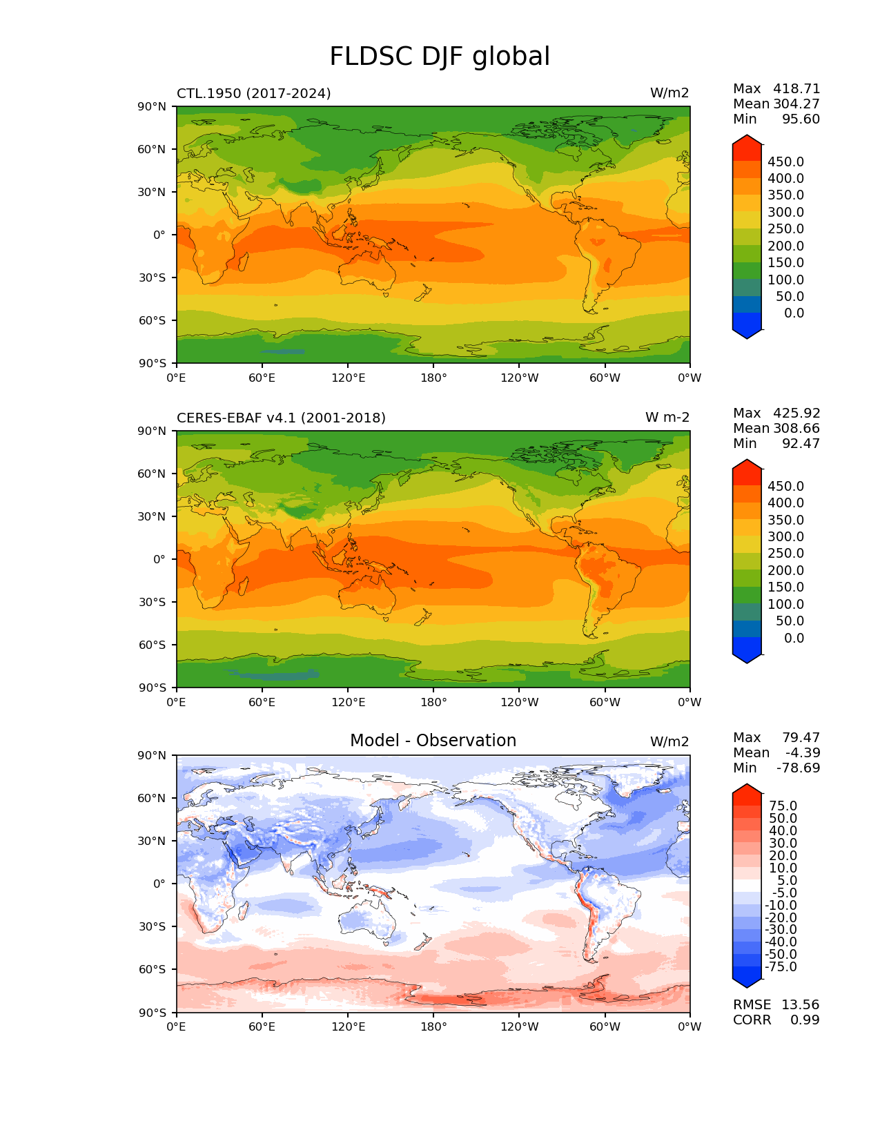 Use this command to recreate this image: | e3sm_diags lat_lon --no_viewer --reference_data_path '/global/cfs/cdirs/e3sm/acme_diags/obs_for_e3sm_diags/climatology/' --test_data_path '/pscratch/sd/x/xsongsio/DATA/CTL.1950/diag/clim_rgr/' --results_dir '/global/cfs/cdirs/e3sm/www/xsongsio/CTL.1950/8yr' --case_id 'CERES-EBAF-surface-v4.1' --run_type 'model_vs_obs' --sets 'lat_lon' --variables 'FLDSC' --seasons 'DJF' --regions 'global' --regrid_tool 'esmf' --regrid_method 'conservative' --num_workers '4' --main_title 'FLDSC DJF global' --backend 'mpl' --output_format 'png' --canvas_size_w '1212' --canvas_size_h '1628' --figsize '8.5' '11.0' --dpi '150' --arrows --contour_levels '0' '50' '100' '150' '200' '250' '300' '350' '400' '450' --test_name 'CTL.1950' --test_title ' ' --test_colormap 'cet_rainbow.rgb' --ref_name 'ceres_ebaf_surface_v4.1' --reference_name 'CERES-EBAF v4.1' --reference_colormap 'cet_rainbow.rgb' --diff_title 'Model - Observation' --diff_colormap 'diverging_bwr.rgb' --diff_levels '-75' '-50' '-40' '-30' '-20' '-10' '-5' '5' '10' '20' '30' '40' '50' '75' --granulate 'variables' 'seasons' 'plevs' 'regions' --selectors 'sets' 'seasons' |
