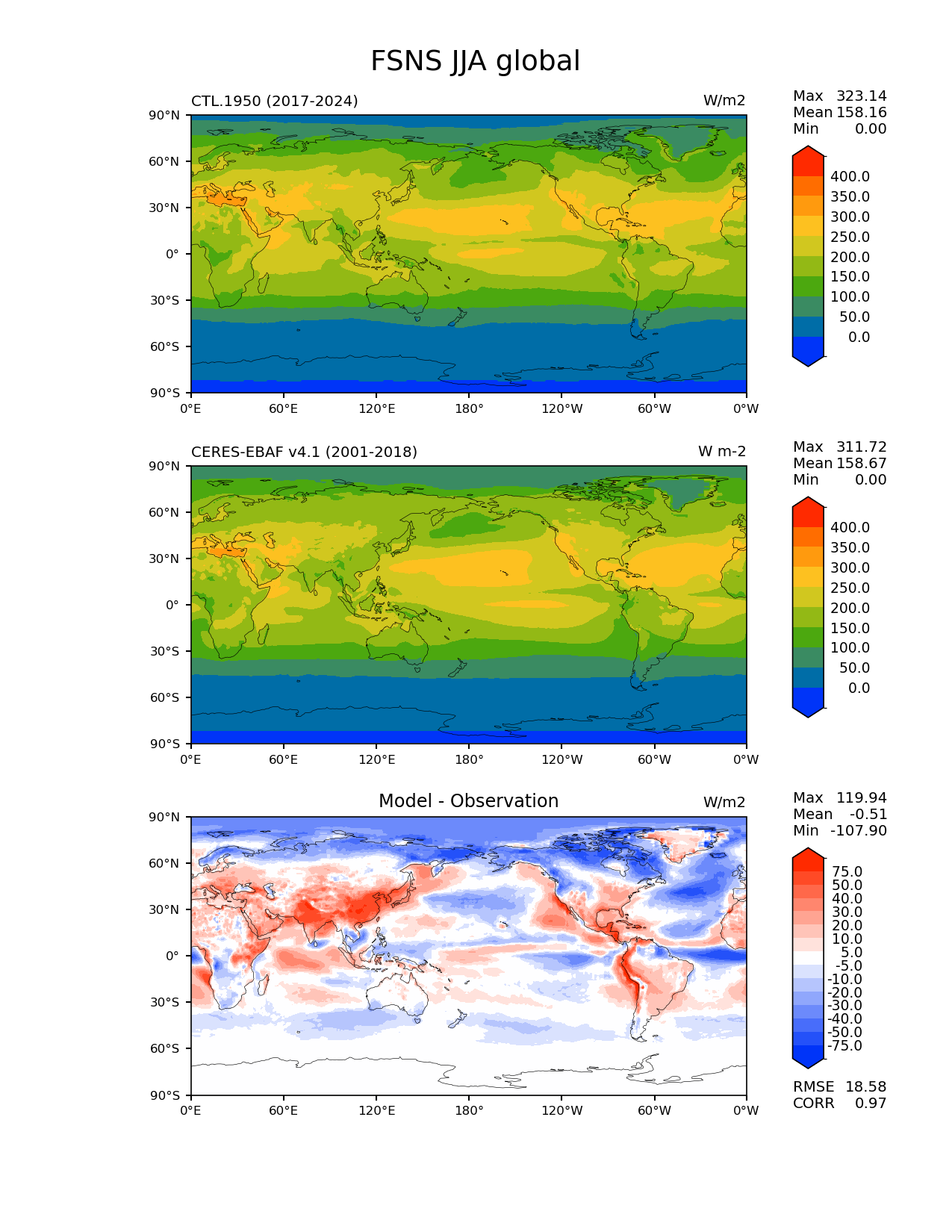 Use this command to recreate this image: | e3sm_diags lat_lon --no_viewer --reference_data_path '/global/cfs/cdirs/e3sm/acme_diags/obs_for_e3sm_diags/climatology/' --test_data_path '/pscratch/sd/x/xsongsio/DATA/CTL.1950/diag/clim_rgr/' --results_dir '/global/cfs/cdirs/e3sm/www/xsongsio/CTL.1950/8yr' --case_id 'CERES-EBAF-surface-v4.1' --run_type 'model_vs_obs' --sets 'lat_lon' --variables 'FSNS' --seasons 'JJA' --regions 'global' --regrid_tool 'esmf' --regrid_method 'conservative' --num_workers '4' --main_title 'FSNS JJA global' --backend 'mpl' --output_format 'png' --canvas_size_w '1212' --canvas_size_h '1628' --figsize '8.5' '11.0' --dpi '150' --arrows --contour_levels '0' '50' '100' '150' '200' '250' '300' '350' '400' --test_name 'CTL.1950' --test_title ' ' --test_colormap 'cet_rainbow.rgb' --ref_name 'ceres_ebaf_surface_v4.1' --reference_name 'CERES-EBAF v4.1' --reference_colormap 'cet_rainbow.rgb' --diff_title 'Model - Observation' --diff_colormap 'diverging_bwr.rgb' --diff_levels '-75' '-50' '-40' '-30' '-20' '-10' '-5' '5' '10' '20' '30' '40' '50' '75' --granulate 'variables' 'seasons' 'plevs' 'regions' --selectors 'sets' 'seasons' |
