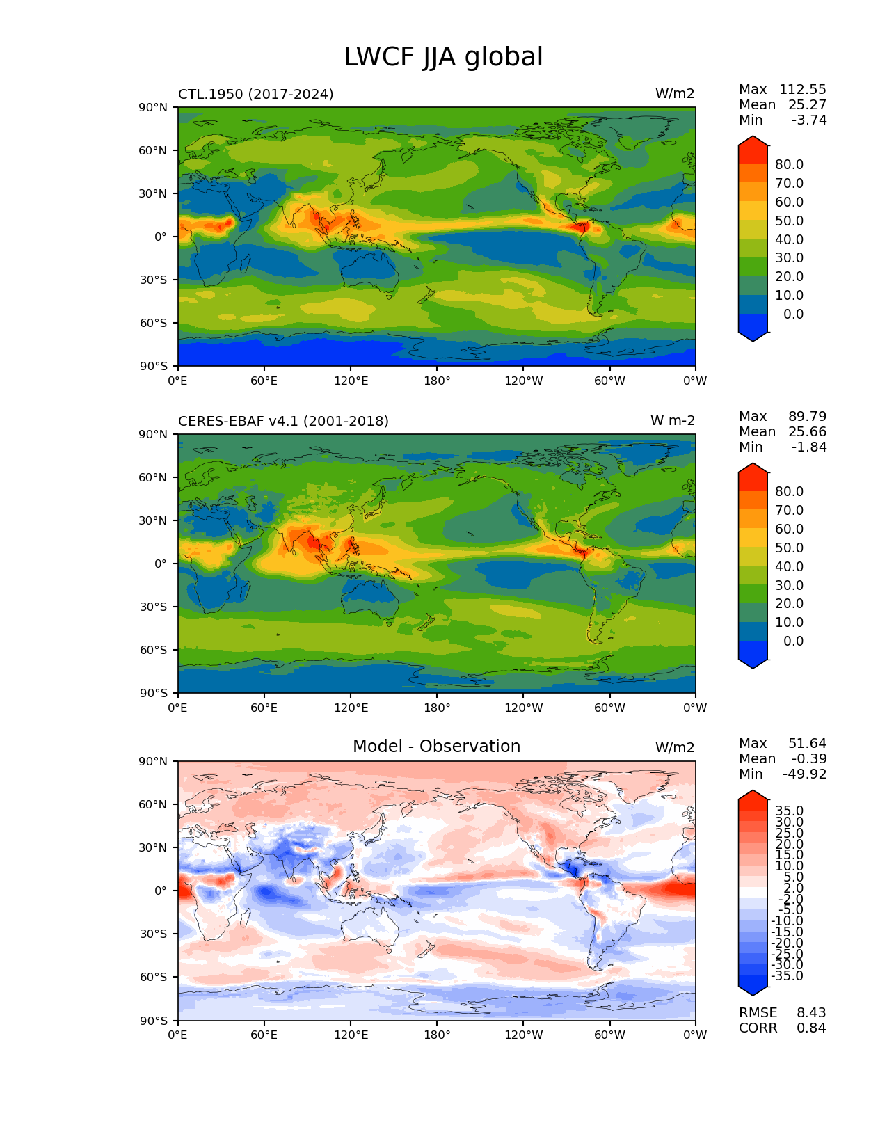 Use this command to recreate this image: | e3sm_diags lat_lon --no_viewer --reference_data_path '/global/cfs/cdirs/e3sm/acme_diags/obs_for_e3sm_diags/climatology/' --test_data_path '/pscratch/sd/x/xsongsio/DATA/CTL.1950/diag/clim_rgr/' --results_dir '/global/cfs/cdirs/e3sm/www/xsongsio/CTL.1950/8yr' --case_id 'CERES-EBAF-TOA-v4.1' --run_type 'model_vs_obs' --sets 'lat_lon' --variables 'LWCF' --seasons 'JJA' --regions 'global' --regrid_tool 'esmf' --regrid_method 'conservative' --num_workers '4' --main_title 'LWCF JJA global' --backend 'mpl' --output_format 'png' --canvas_size_w '1212' --canvas_size_h '1628' --figsize '8.5' '11.0' --dpi '150' --arrows --contour_levels '0' '10' '20' '30' '40' '50' '60' '70' '80' --test_name 'CTL.1950' --test_title ' ' --test_colormap 'cet_rainbow.rgb' --ref_name 'ceres_ebaf_toa_v4.1' --reference_name 'CERES-EBAF v4.1' --reference_colormap 'cet_rainbow.rgb' --diff_title 'Model - Observation' --diff_colormap 'diverging_bwr.rgb' --diff_levels '-35' '-30' '-25' '-20' '-15' '-10' '-5' '-2' '2' '5' '10' '15' '20' '25' '30' '35' --granulate 'variables' 'seasons' 'plevs' 'regions' --selectors 'sets' 'seasons' |