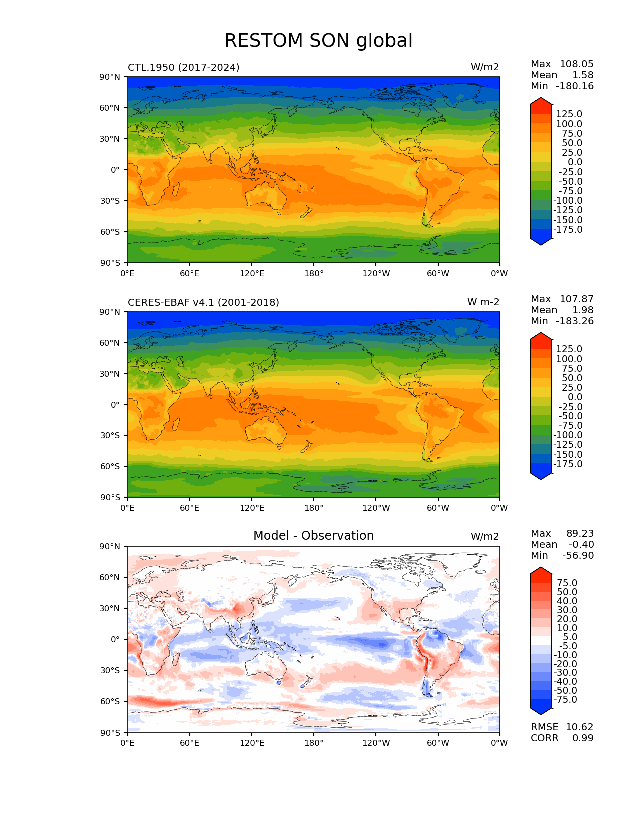 Use this command to recreate this image: | e3sm_diags lat_lon --no_viewer --reference_data_path '/global/cfs/cdirs/e3sm/acme_diags/obs_for_e3sm_diags/climatology/' --test_data_path '/pscratch/sd/x/xsongsio/DATA/CTL.1950/diag/clim_rgr/' --results_dir '/global/cfs/cdirs/e3sm/www/xsongsio/CTL.1950/8yr' --case_id 'CERES-EBAF-TOA-v4.1' --run_type 'model_vs_obs' --sets 'lat_lon' --variables 'RESTOM' --seasons 'SON' --regions 'global' --regrid_tool 'esmf' --regrid_method 'conservative' --num_workers '4' --main_title 'RESTOM SON global' --backend 'mpl' --output_format 'png' --canvas_size_w '1212' --canvas_size_h '1628' --figsize '8.5' '11.0' --dpi '150' --arrows --contour_levels '-175' '-150' '-125' '-100' '-75' '-50' '-25' '0' '25' '50' '75' '100' '125' --test_name 'CTL.1950' --test_title ' ' --test_colormap 'cet_rainbow.rgb' --ref_name 'ceres_ebaf_toa_v4.1' --reference_name 'CERES-EBAF v4.1' --reference_colormap 'cet_rainbow.rgb' --diff_title 'Model - Observation' --diff_colormap 'diverging_bwr.rgb' --diff_levels '-75' '-50' '-40' '-30' '-20' '-10' '-5' '5' '10' '20' '30' '40' '50' '75' --granulate 'variables' 'seasons' 'plevs' 'regions' --selectors 'sets' 'seasons' |
