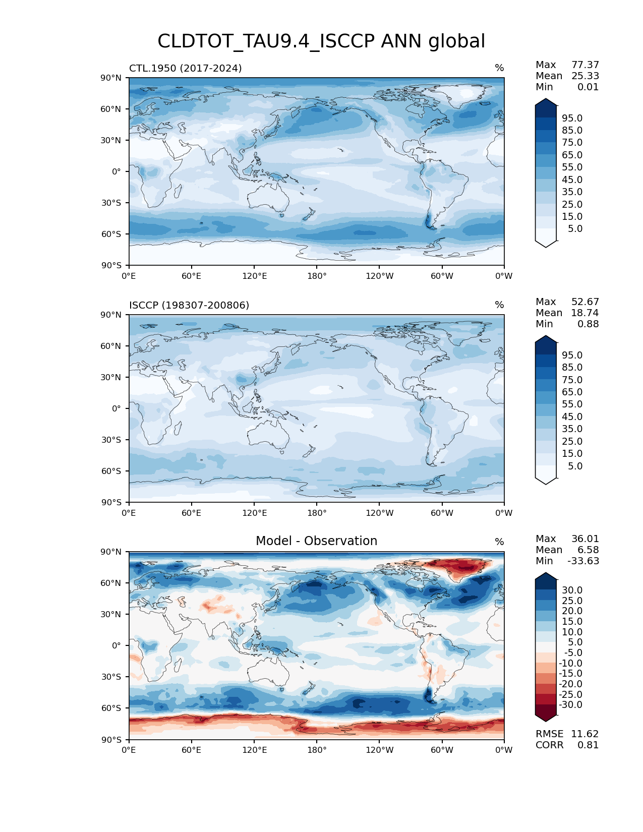 Use this command to recreate this image: | e3sm_diags lat_lon --no_viewer --reference_data_path '/global/cfs/cdirs/e3sm/acme_diags/obs_for_e3sm_diags/climatology/' --test_data_path '/pscratch/sd/x/xsongsio/DATA/CTL.1950/diag/clim_rgr/' --results_dir '/global/cfs/cdirs/e3sm/www/xsongsio/CTL.1950/8yr' --case_id 'Cloud ISCCP' --run_type 'model_vs_obs' --sets 'lat_lon' --variables 'CLDTOT_TAU9.4_ISCCP' --seasons 'ANN' --regions 'global' --regrid_tool 'esmf' --regrid_method 'conservative' --num_workers '4' --main_title 'CLDTOT_TAU9.4_ISCCP ANN global' --backend 'mpl' --output_format 'png' --canvas_size_w '1212' --canvas_size_h '1628' --figsize '8.5' '11.0' --dpi '150' --arrows --contour_levels '5' '15' '25' '35' '45' '55' '65' '75' '85' '95' --test_name 'CTL.1950' --test_title ' ' --test_colormap 'Blues' --ref_name 'ISCCPCOSP' --reference_name 'ISCCP' --reference_colormap 'Blues' --diff_title 'Model - Observation' --diff_colormap 'RdBu' --diff_levels '-30' '-25' '-20' '-15' '-10' '-5' '5' '10' '15' '20' '25' '30' --granulate 'variables' 'seasons' 'plevs' 'regions' --selectors 'sets' 'seasons' |